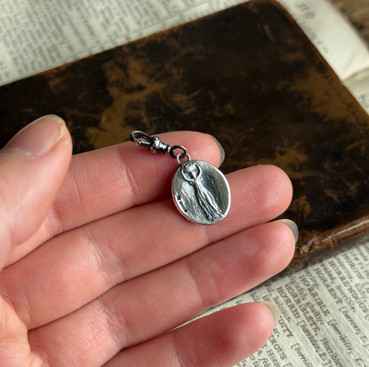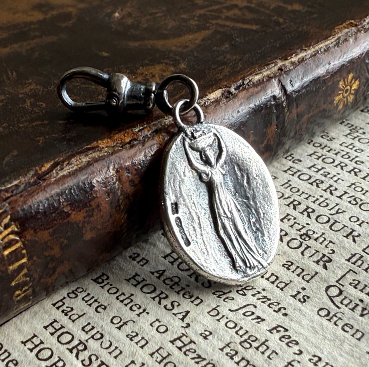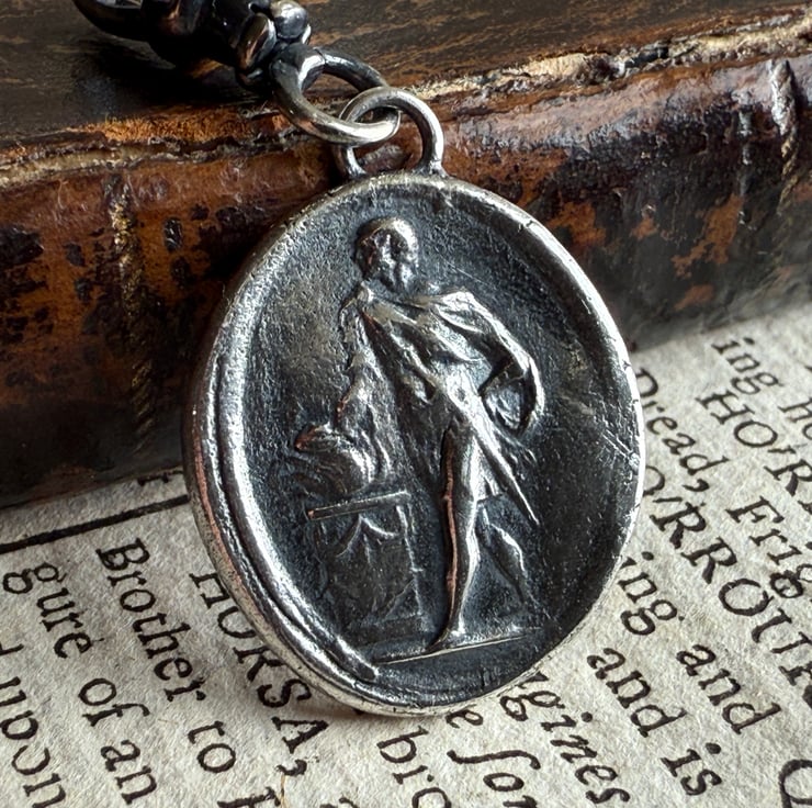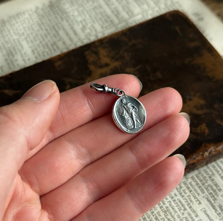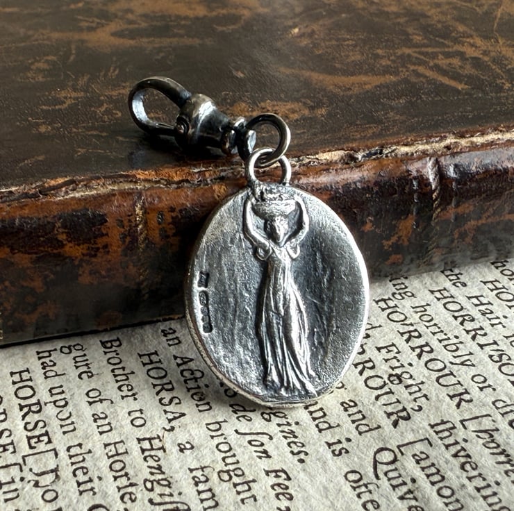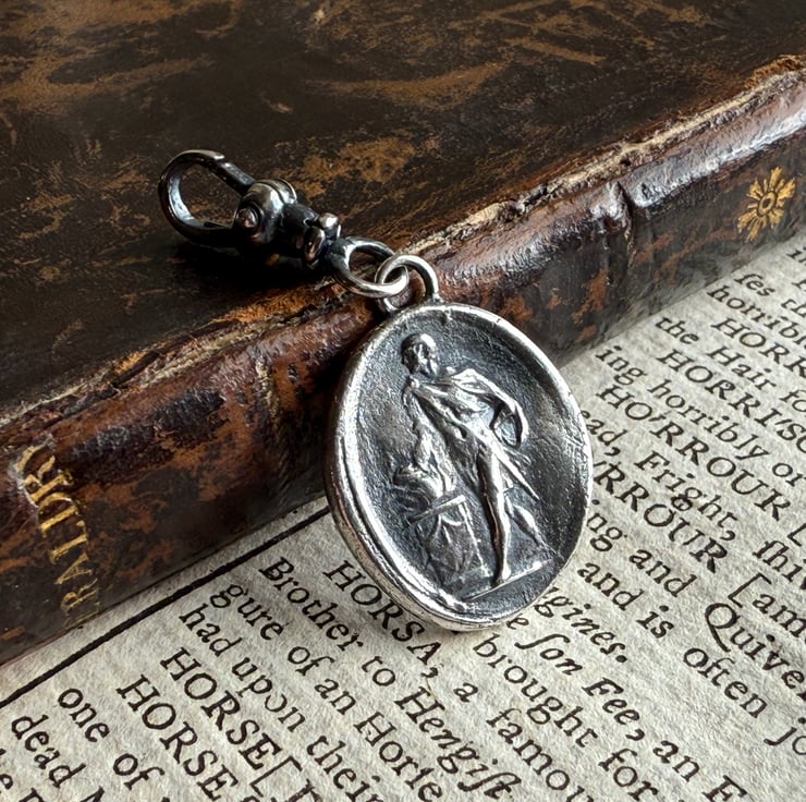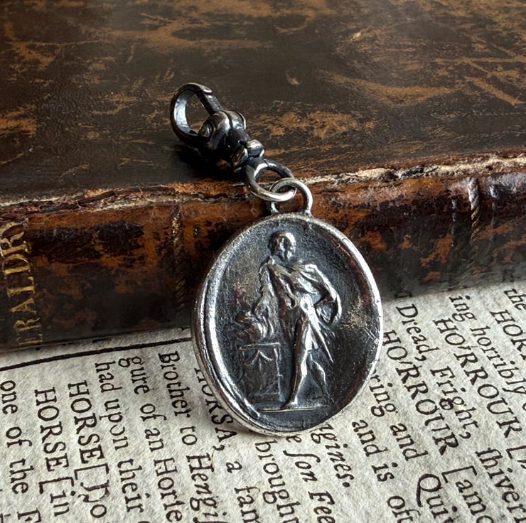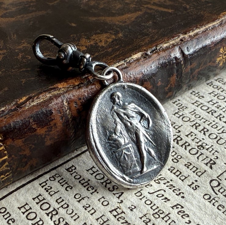 A double sided clip-on wax seal pendant/charm. Made from the impressions of two antique intaglios from Alex's beloved collection, featuring two classical Roman figures. It is made in recycled sterling silver.