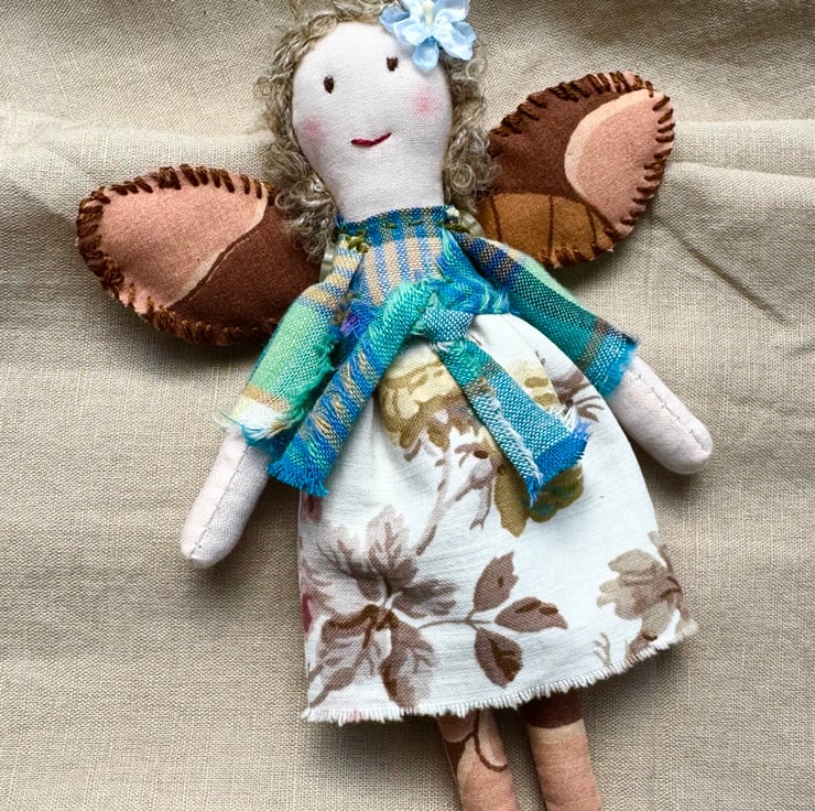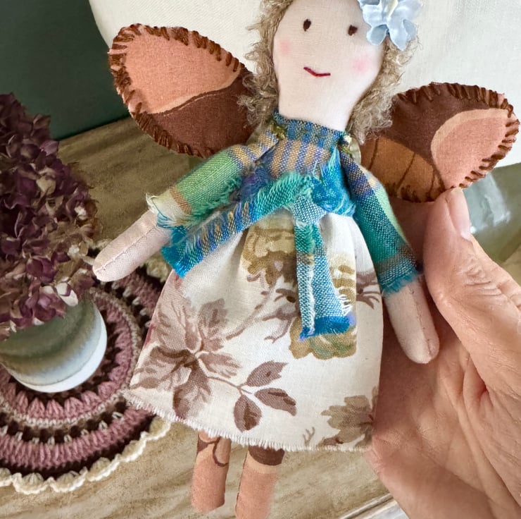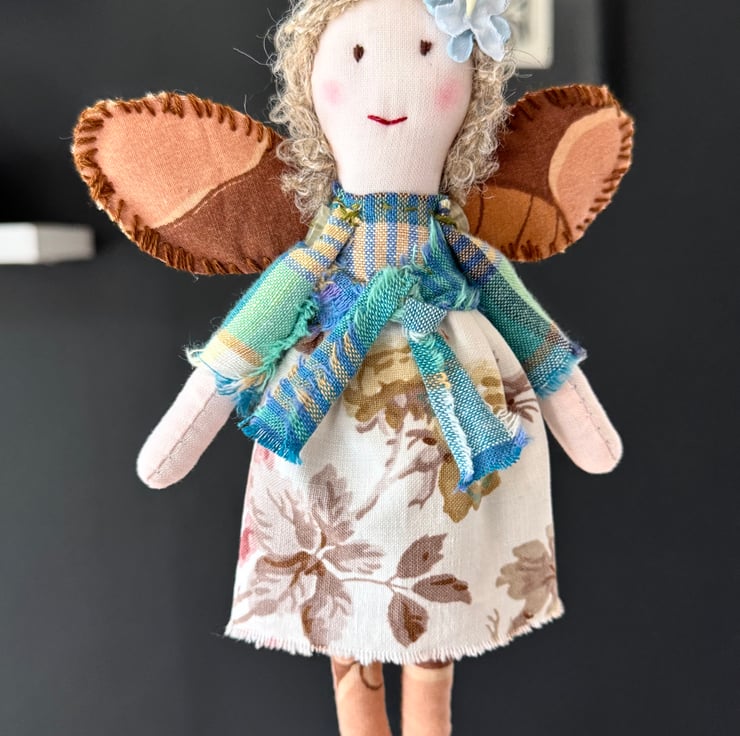 She is made from a variety of fabrics both vintage and modern, and she has handmade wings. I have created her hair from a mohair mixed yarn