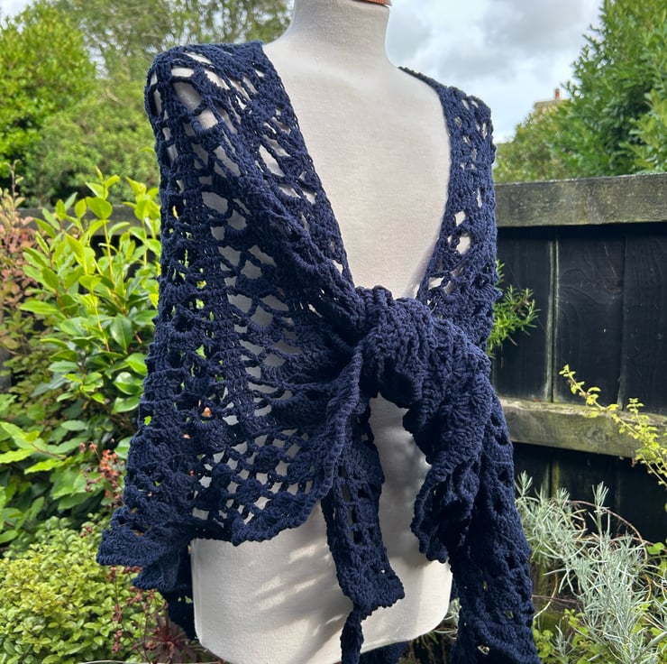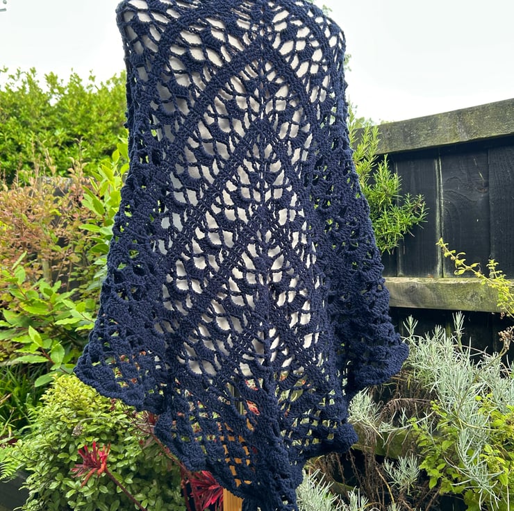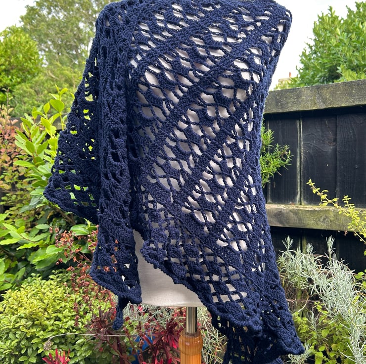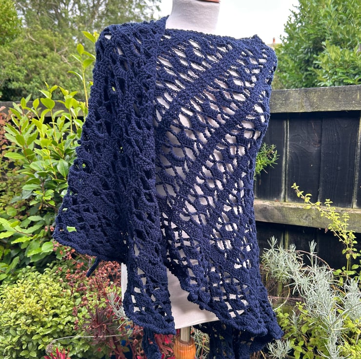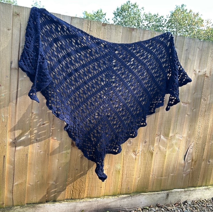 The shawl is triangle shaped measuring 110 at deepest by 220 centimetres wingspan.