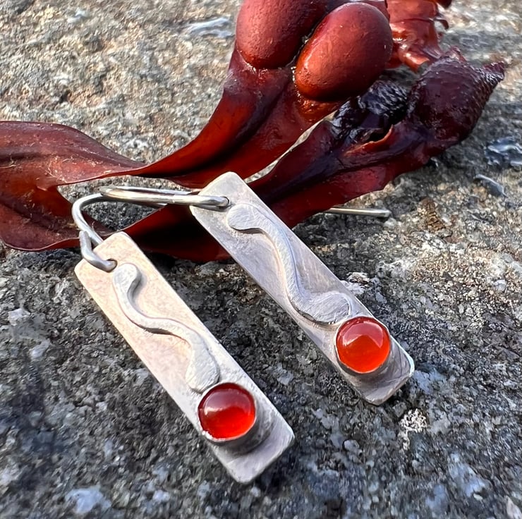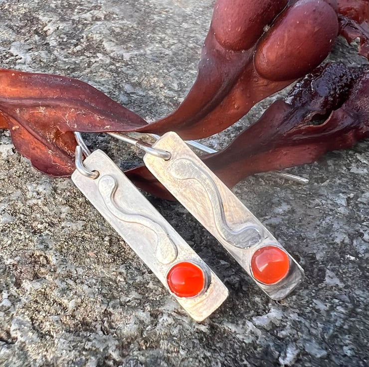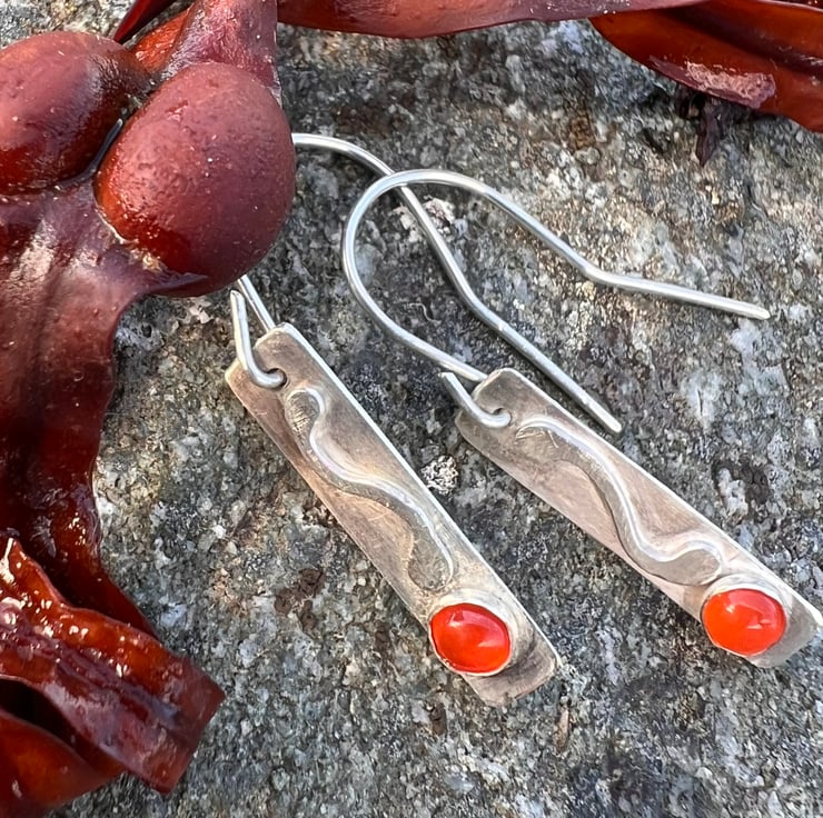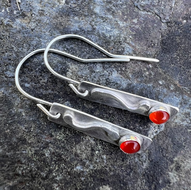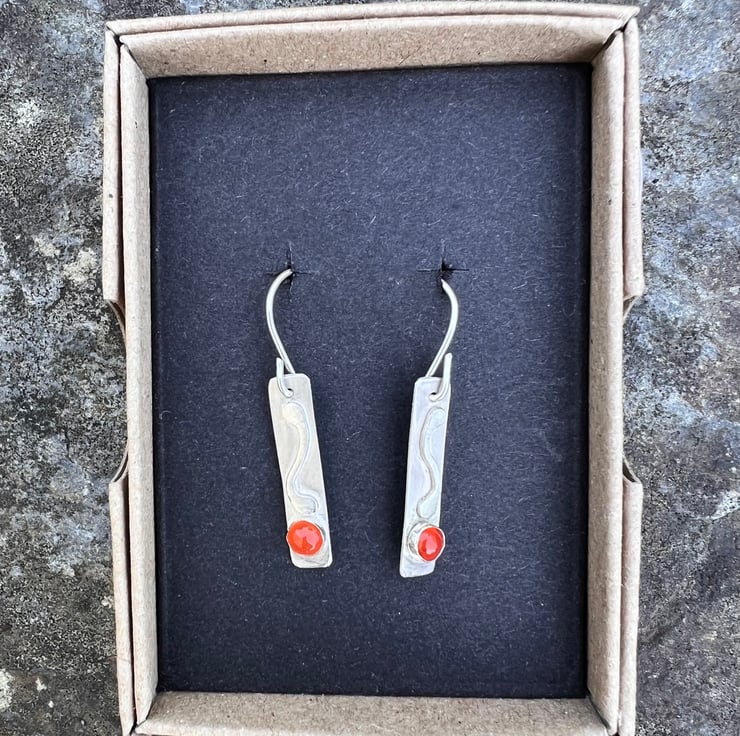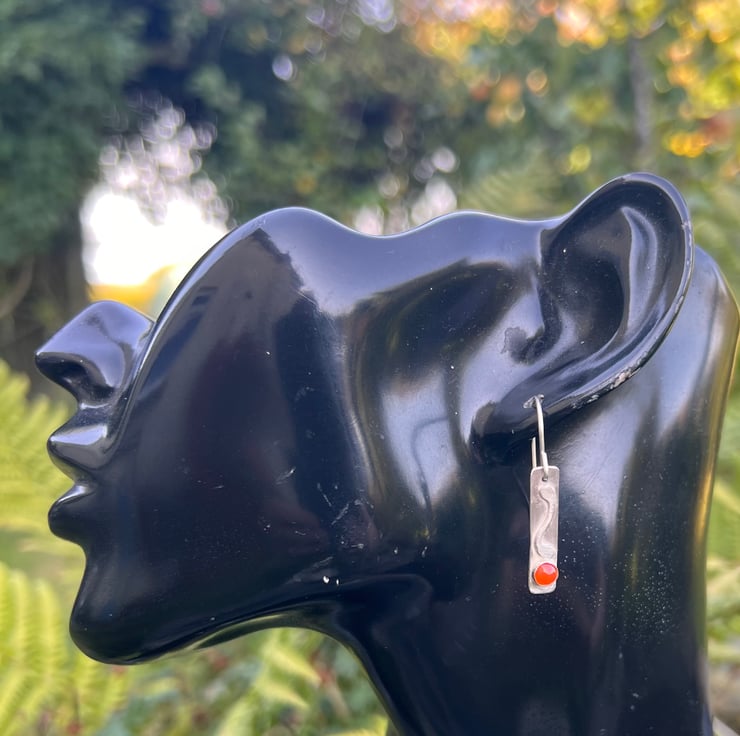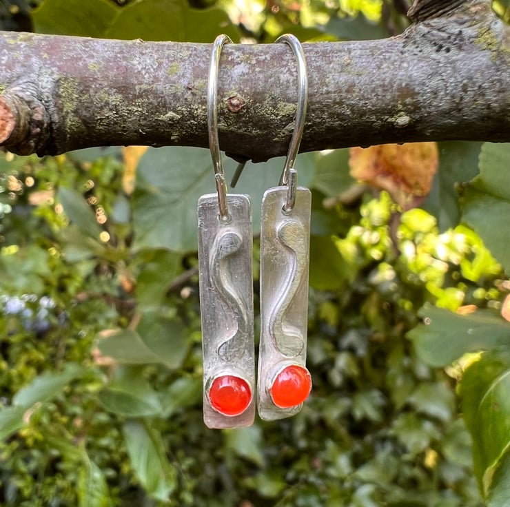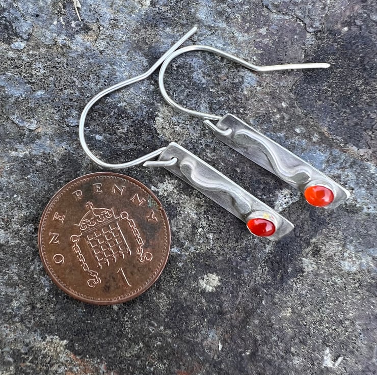 The length of the earrings is 32mm /1.25 inches from the top of the handmade sterling silver hook.The length of the silver is 22mm/ nearly 1 inch and the Carnelian is 4mm in diameter. All Dover is from a eco recycled UK source.