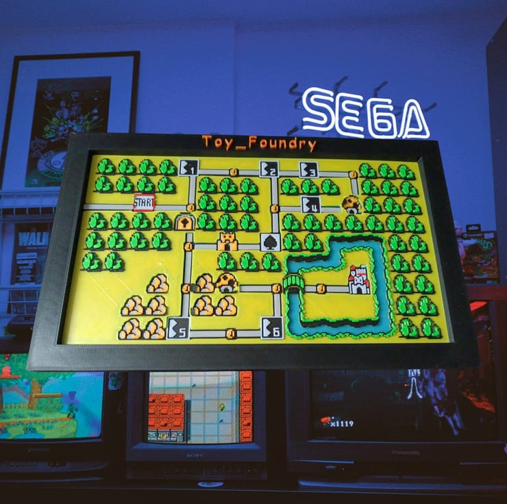 This is a 3D model inspired by Overworld 1 from the classic NES game Super Mario Bros. 3, designed with a pixel art style and a layered 3D effect.
