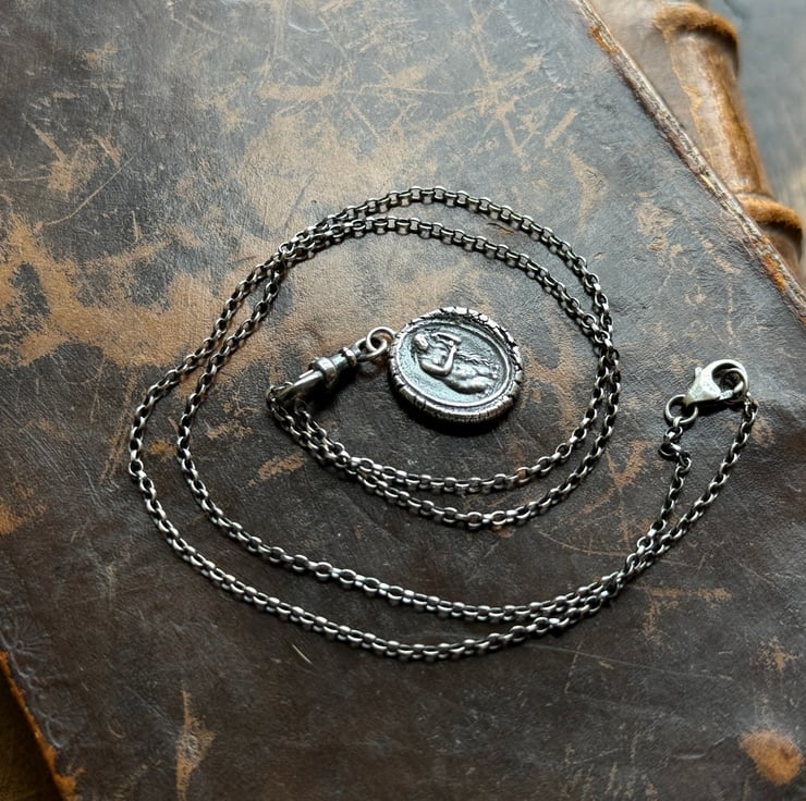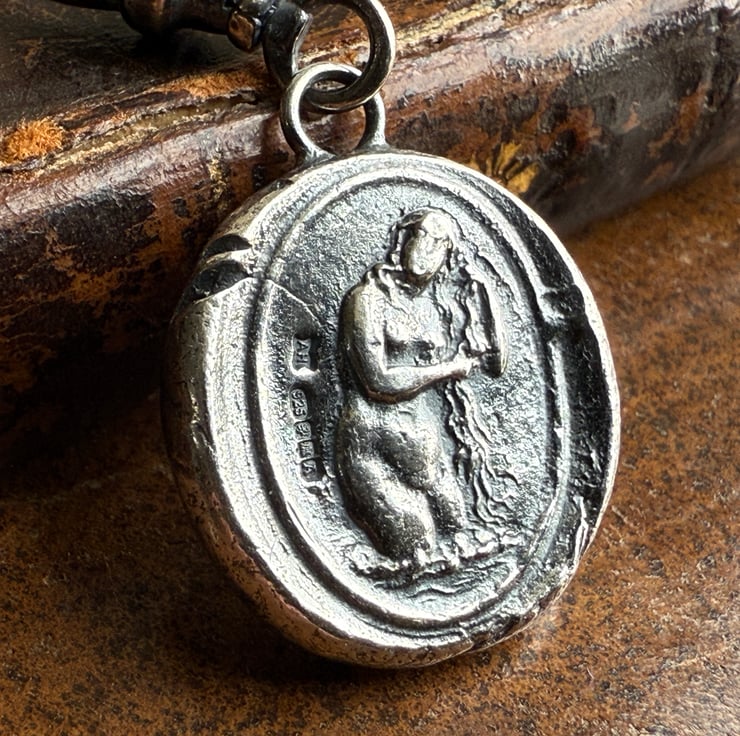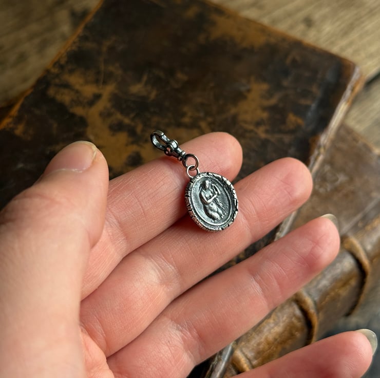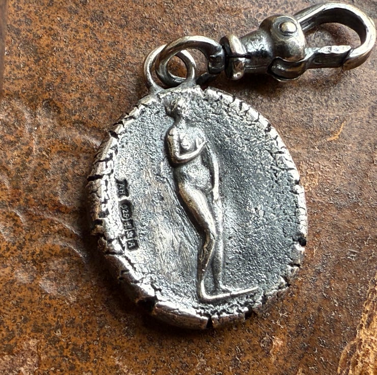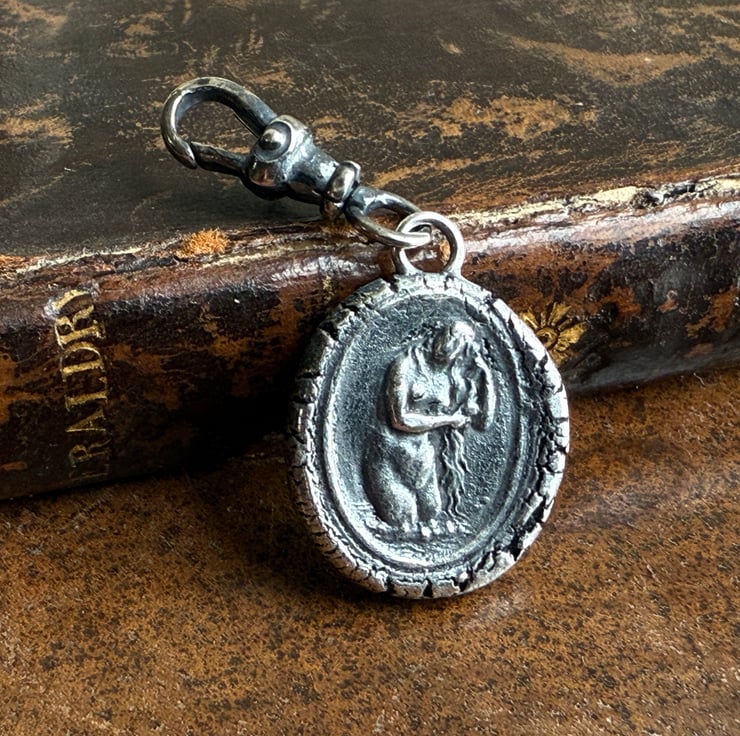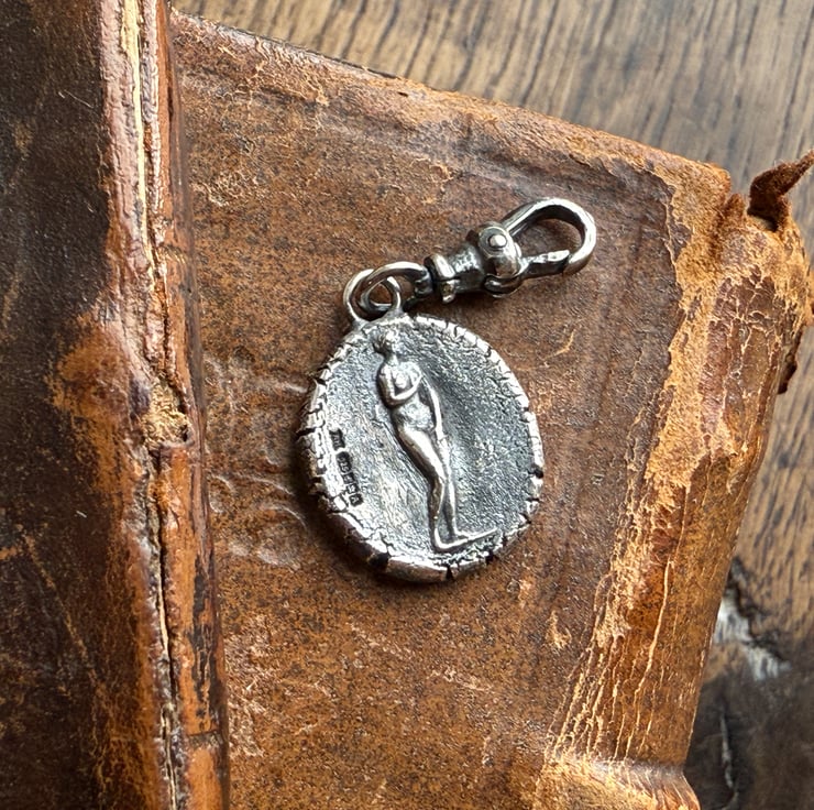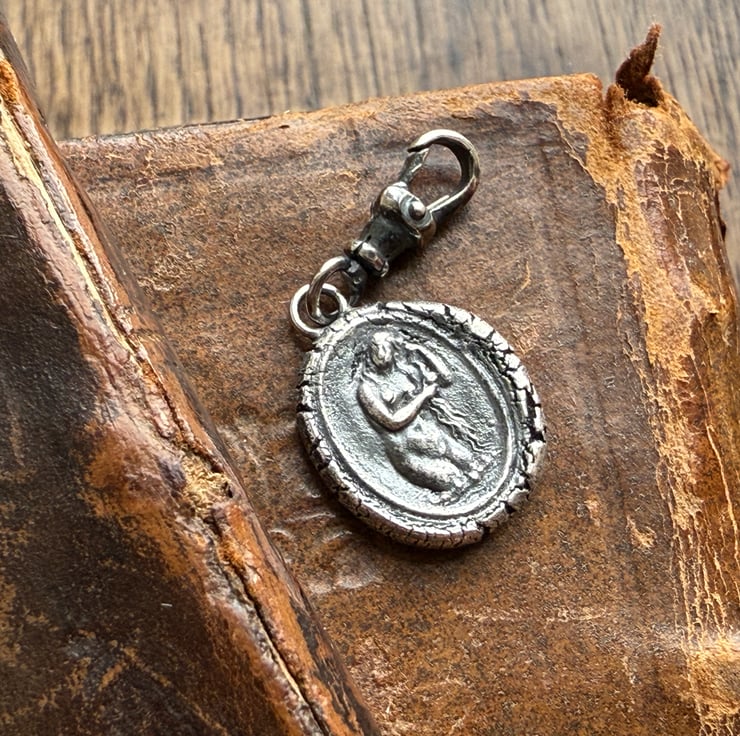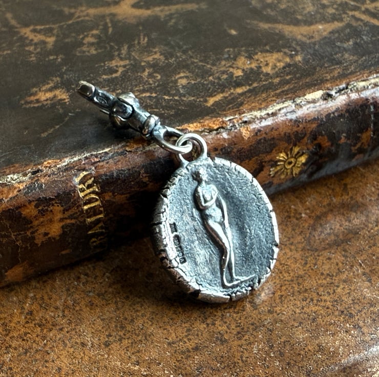 A double sided clip-on wax seal pendant/charm. Made from the impressions of two antique glass intaglios from Alex's beloved collection, featuring two classical but-naked ladies. It is made in recycled sterling silver.