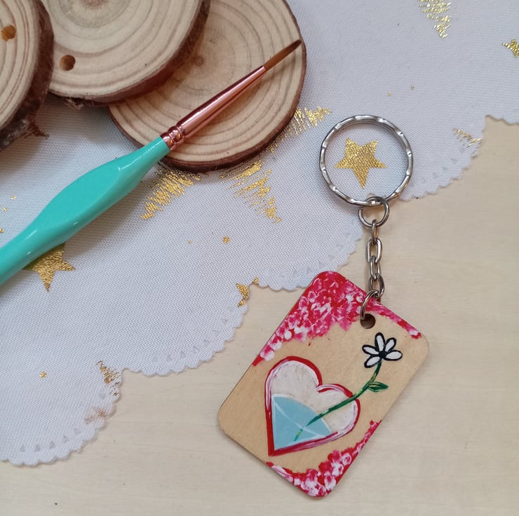 A 3cm x 4cm wooden rectangular keyring with a hand painted heart vase and simple daisy design with pink and white details