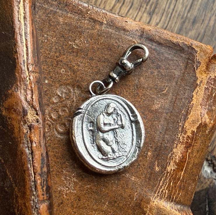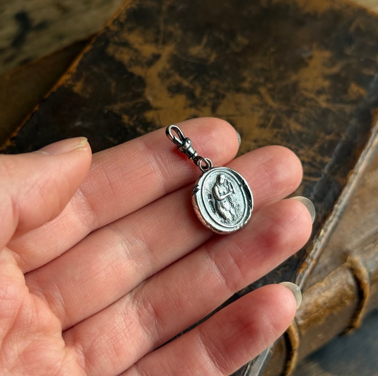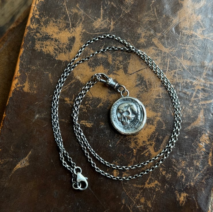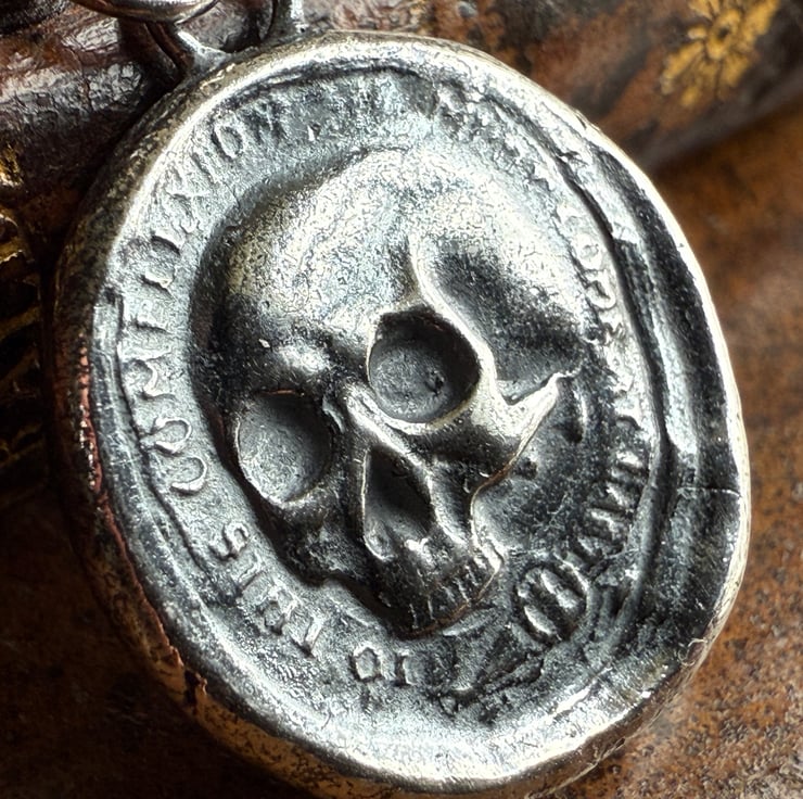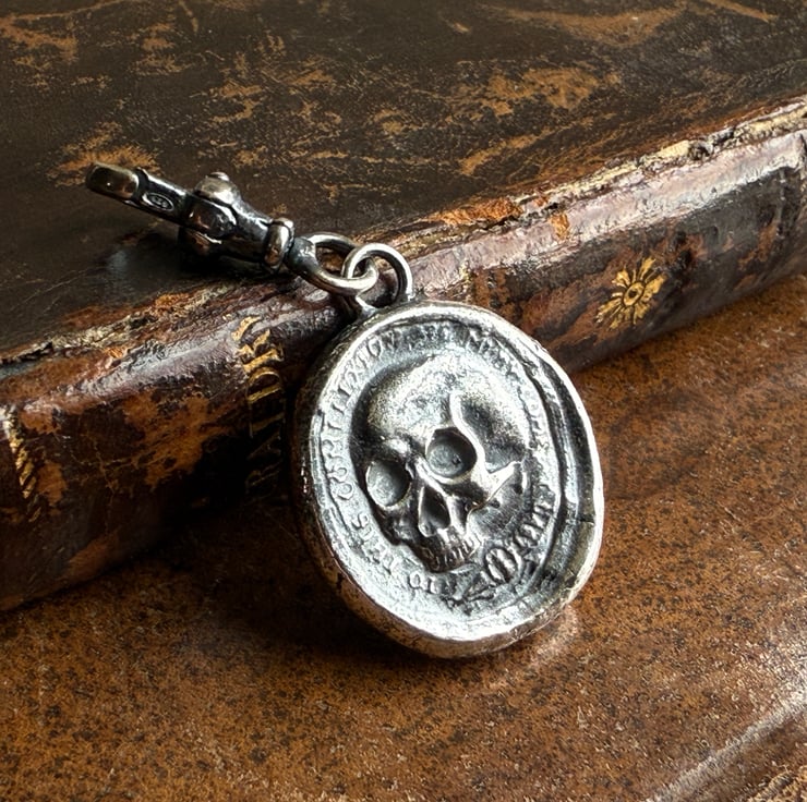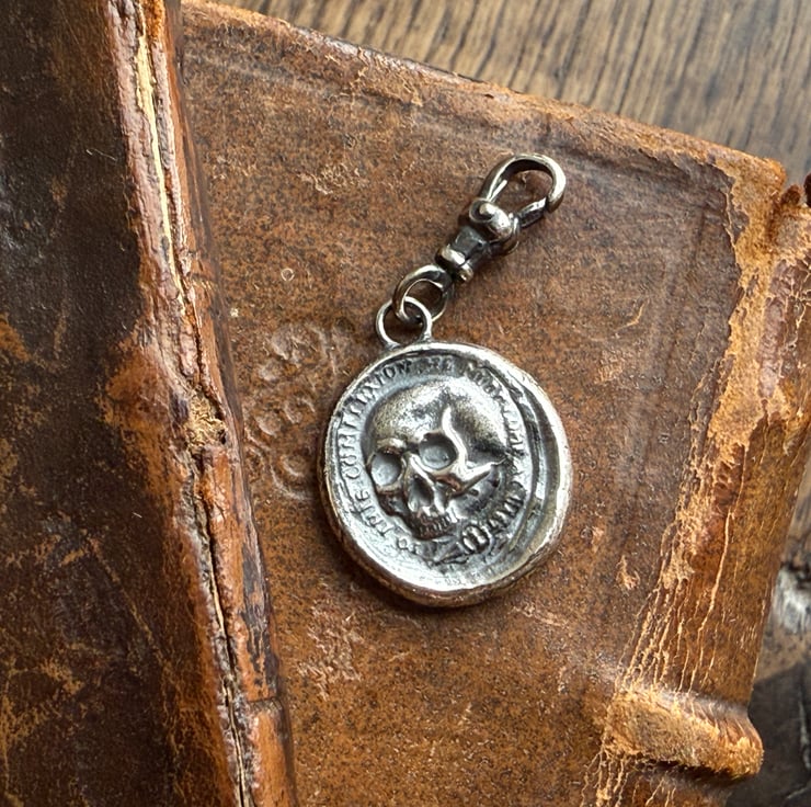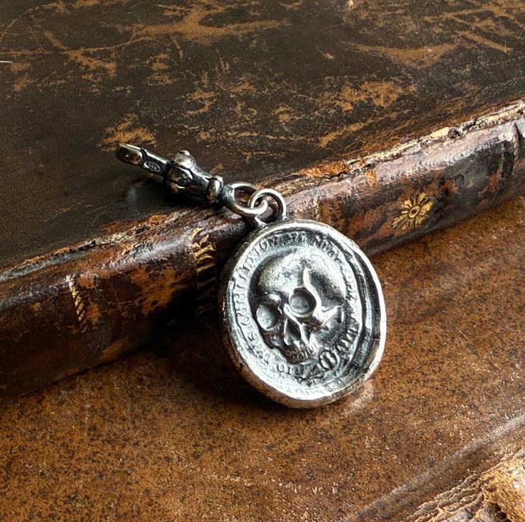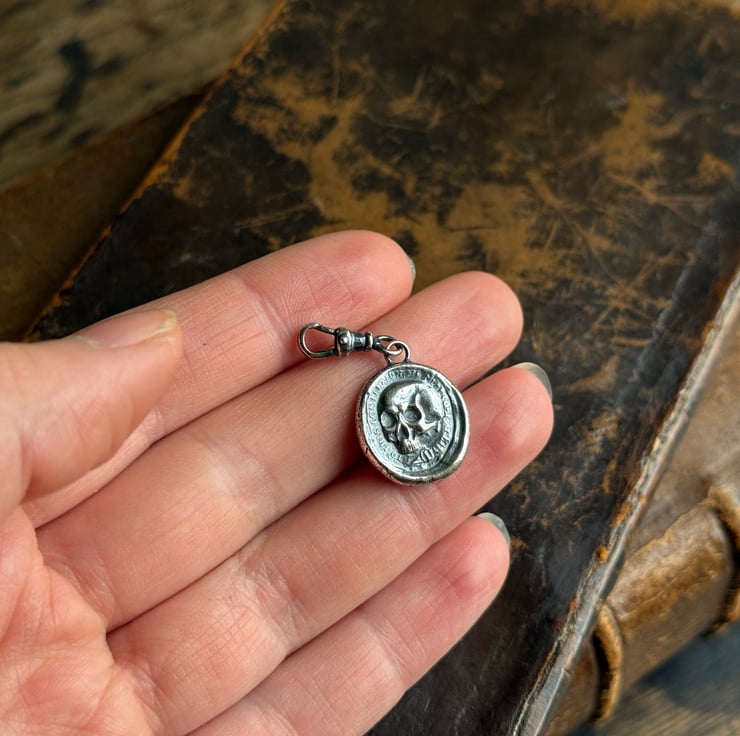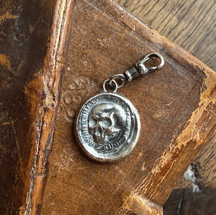 A double sided clip-on wax seal pendant/charm. Made from the impressions of two 18th & 17thC seals from Alex's beloved collection, the oldest features a human skull and the English motto "TO THIS COMPLETION WE MUST COME AT LAST". On the reverse is the impression of a nude bathing lady figure. It is made in recycled sterling silver.