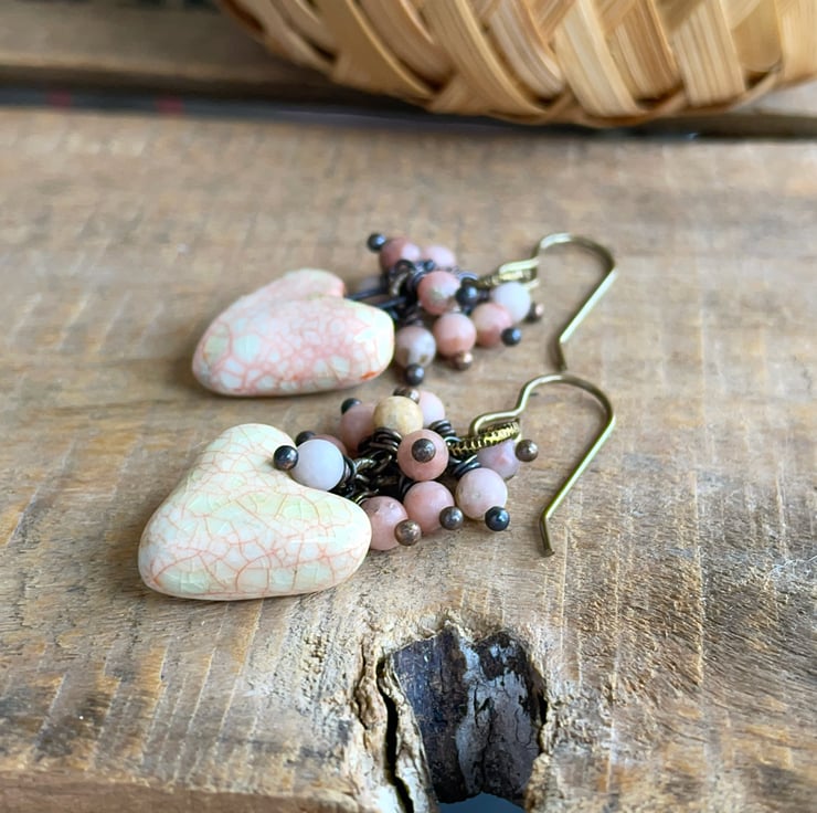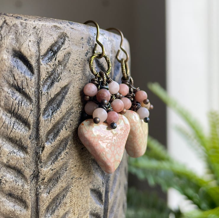 The ceramic hearts have a warm crackle glaze that makes each pair unique, while the wire wrapped pink jasper rounds above add a touch of texture.