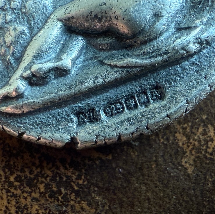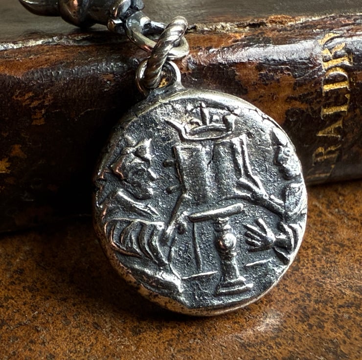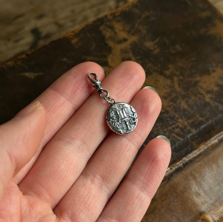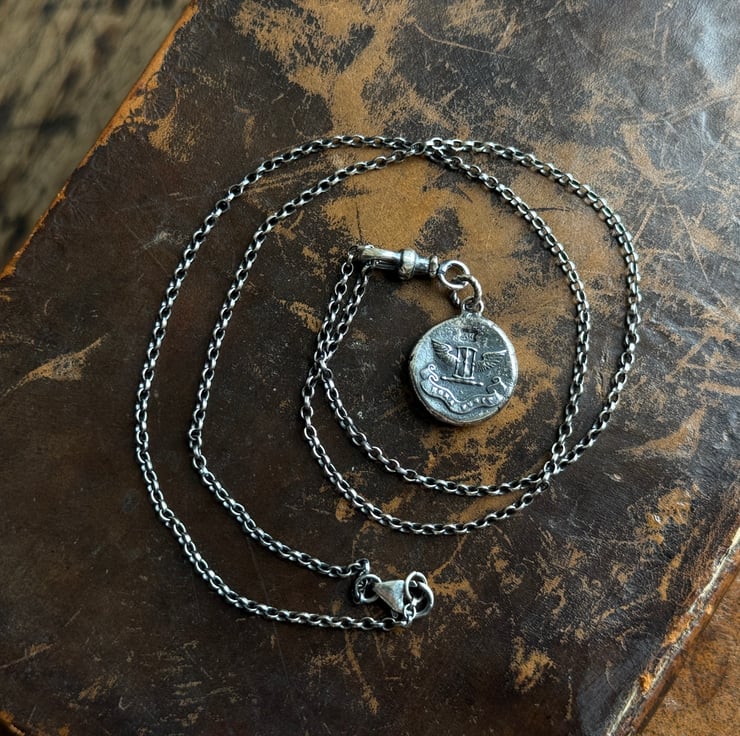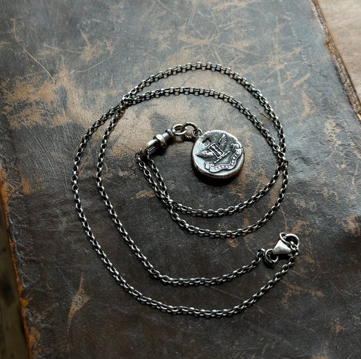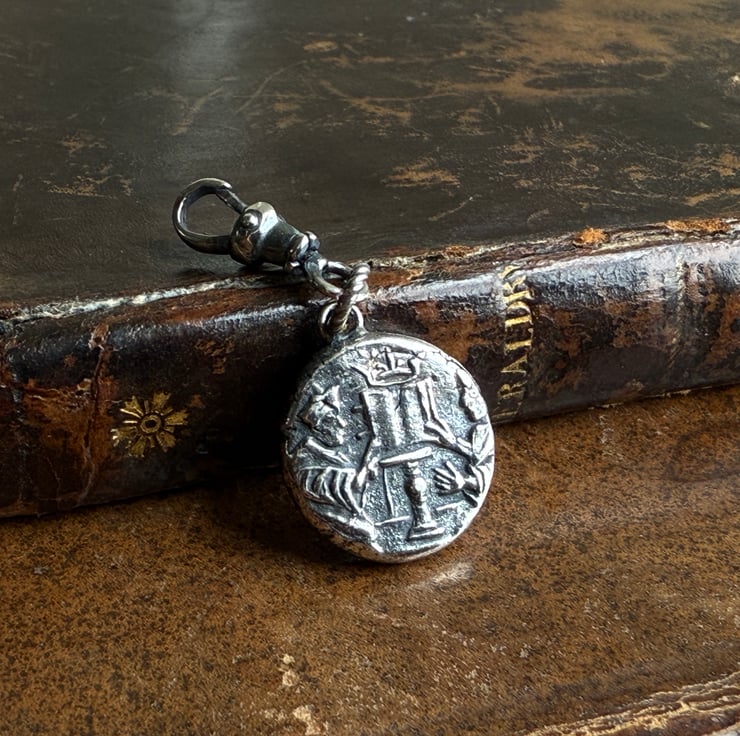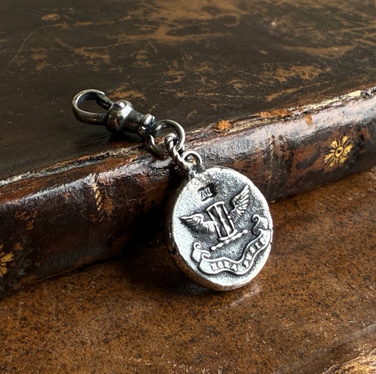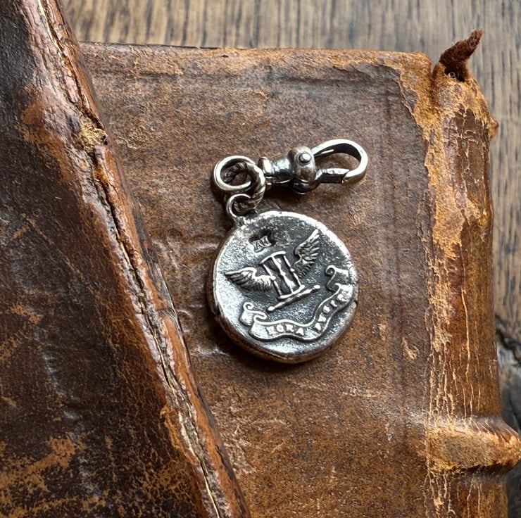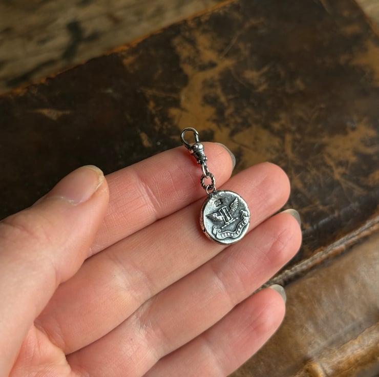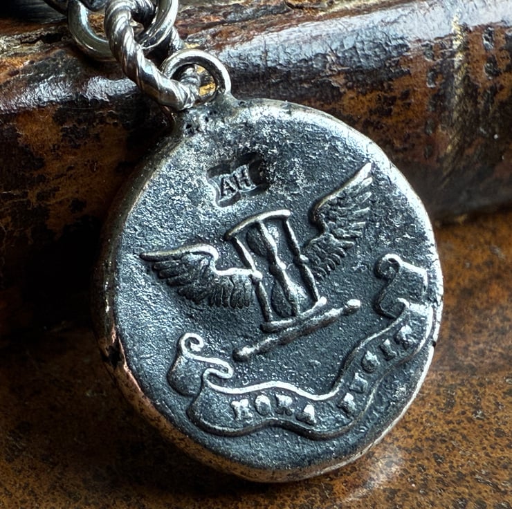 A double sided clip-on wax seal pendant/charm. Made from the impressions of two antique intaglios from Alex's beloved collection, featuring a classic winged hourglass motif with the latin motto "HORA FUGIT" (time flies.) And the partial impression of a 17th century document seal on the reverse. It is made in recycled sterling silver.
