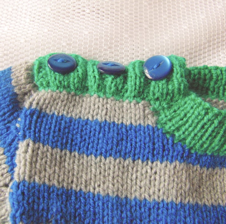 Jumper to be knitted in 100% wool yarn for a 0 - 9 months old baby 16 -18 inch chest, in blue, grey and green double knitting yarn.