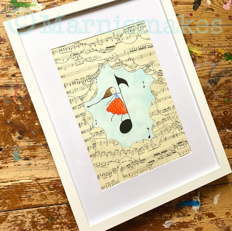 'Go Where The Music Takes You', whimsical, music-themed, framed illustration finished in gouache with some assemblage/collaged sheet music, measuring 21 x 29.4cm and mounted and set in a simple white frame measuring 32 x 44cm, this intricately detailed original piece of art would be perfect as a gift!