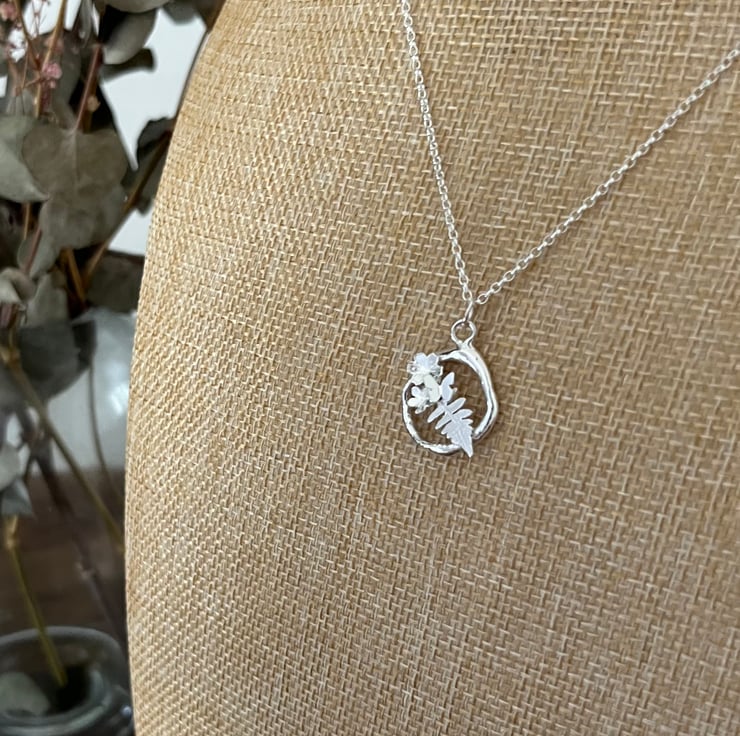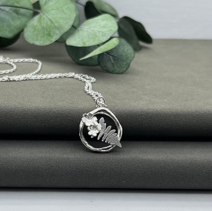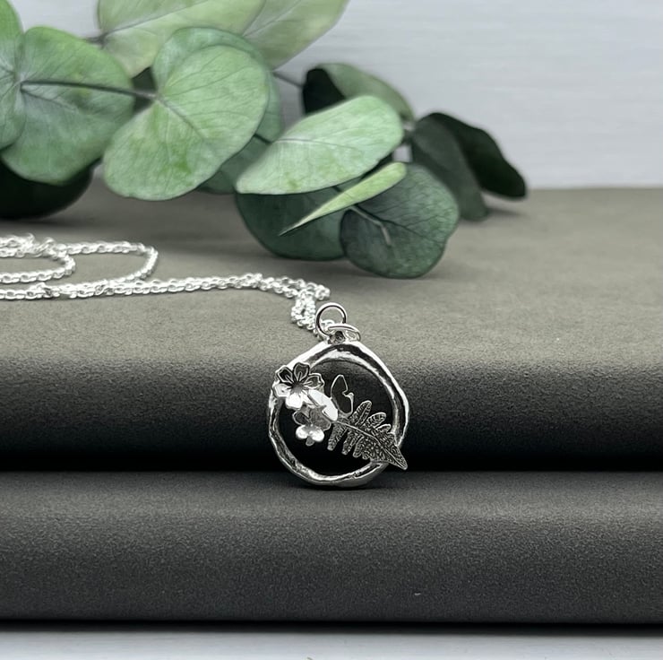 Individually handmade design. A melted silver circle with a pretty fern leaf, flowers and butterfly.