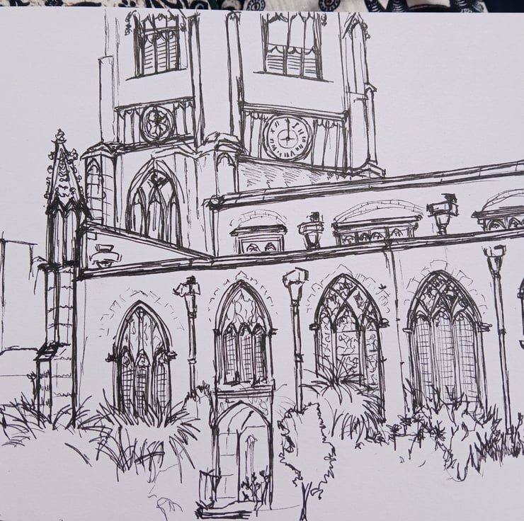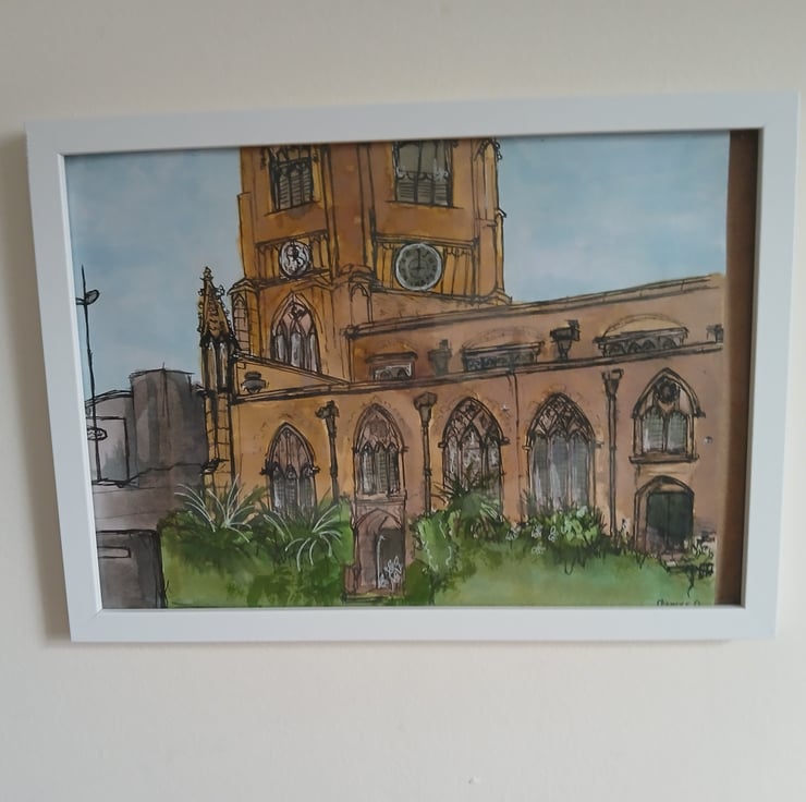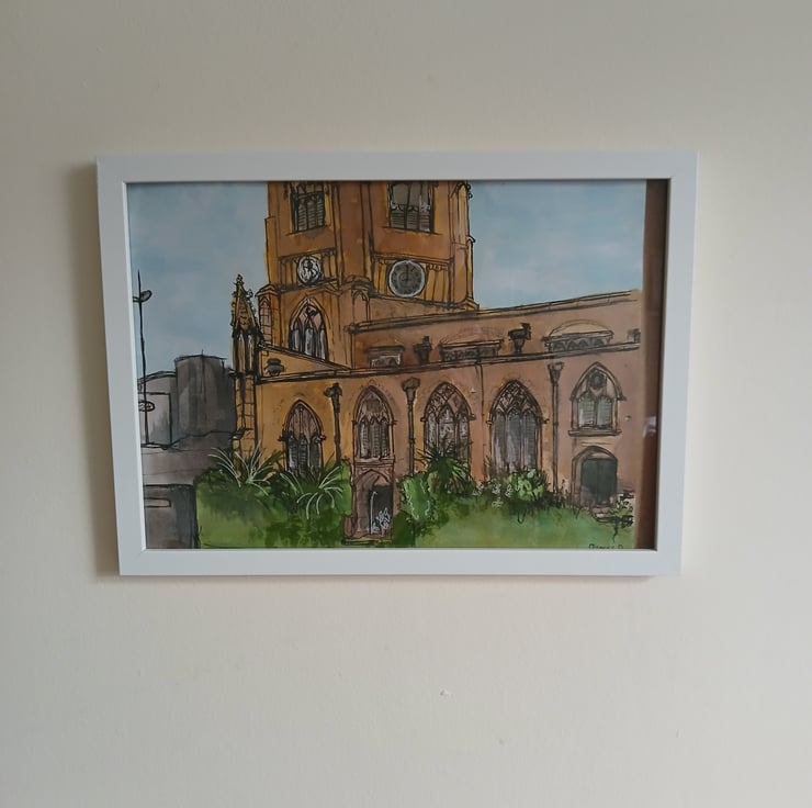 My original watercolour of Liverpool's St Nicholas Parish Church. fine liner pen and watercolour, A4, sketch pad paper. Framed or unframed.