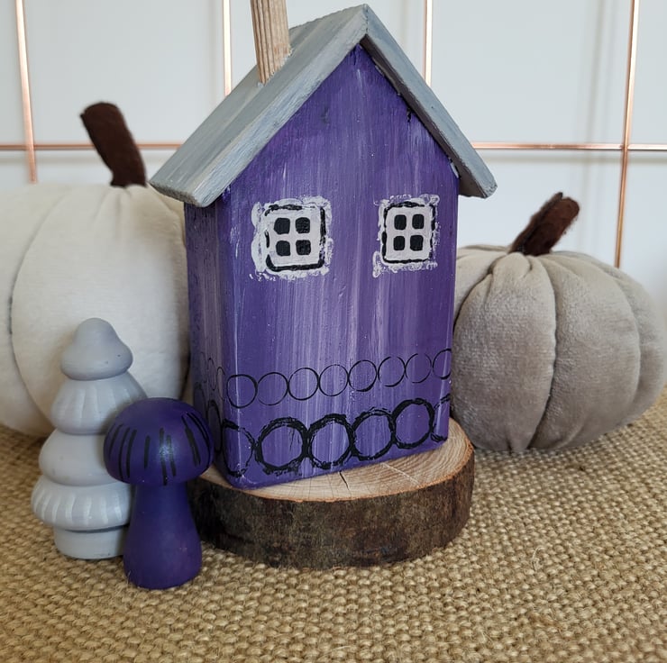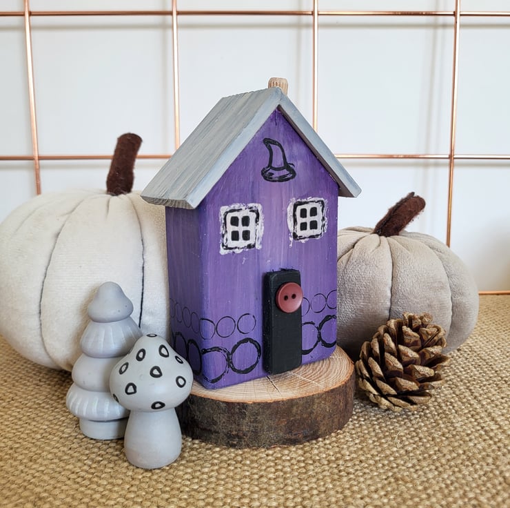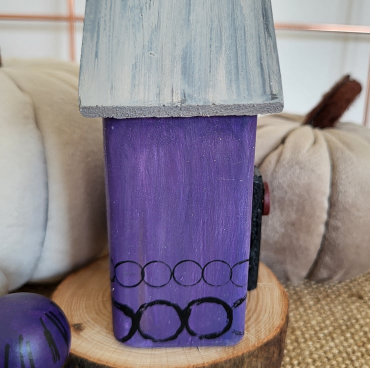 Hand painted in lovely shades of purple and greys, with a little witches hat decoration on the front top centre and a cute little button decorating the doorway. The house is decorated on all four sides, with a black circular repeating pattern running around the bottom, complimenting the purple paint work.