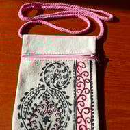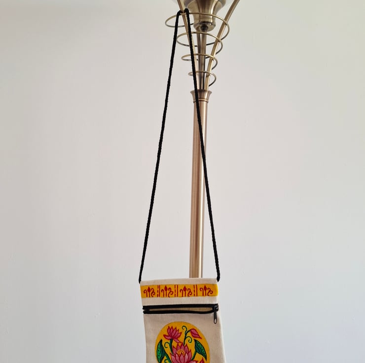 The fabric is painted with an acrylic colours. This rectangular shaped bag is comes with zipper closer. The material of this bag is cotton.