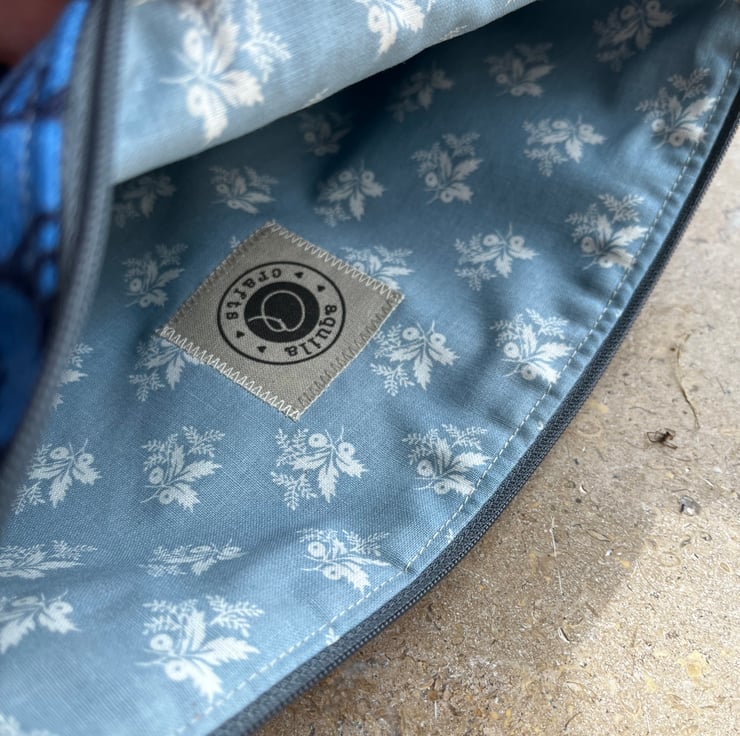 The bag is lined with blue floral Laura Ashley cotton. This spacious bag measures 27cm across the zip by 18cm tall. The bottom is boxed to give volume. There is a layer of interfacing to give structure.