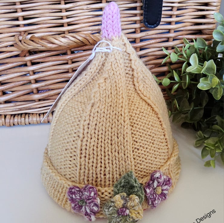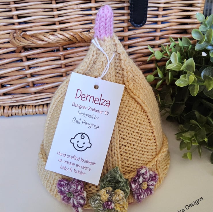 This is a genuine designer product. It has not been reproduced from any commercially published knitting pattern. Please respect the designer's full time profession, skills and modest income for 2.45 hours quality craftsmanship by not replicating it. This includes using different colourways, stitch formation designs, different flower designs, images and artwork.