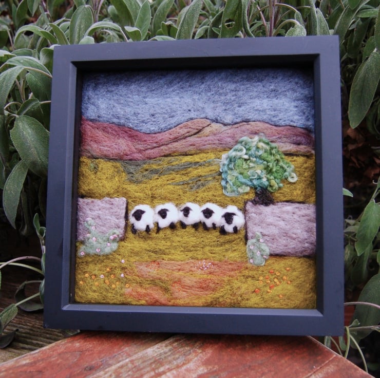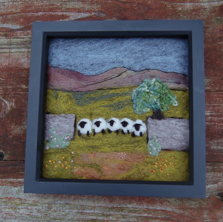 Needlefelted wool picture of five sheep stood together by a gap in a traditional Yorkshire dry stone wall. A tree is behind the wall and scattering of hand embroidered flowers at the base.