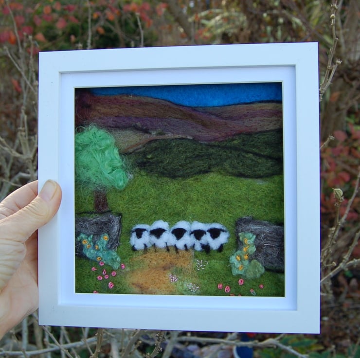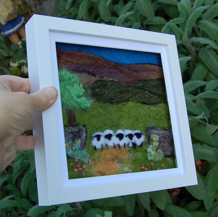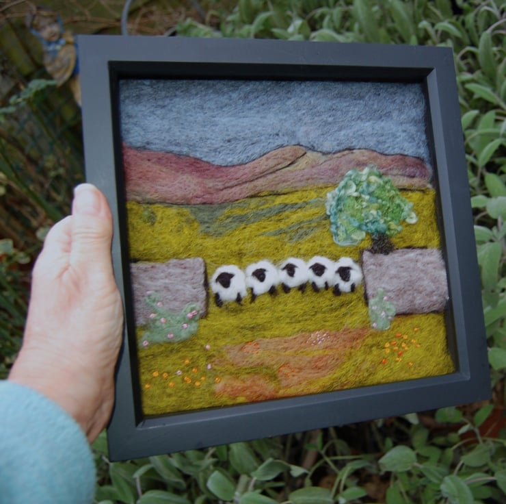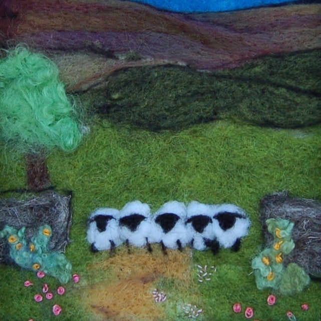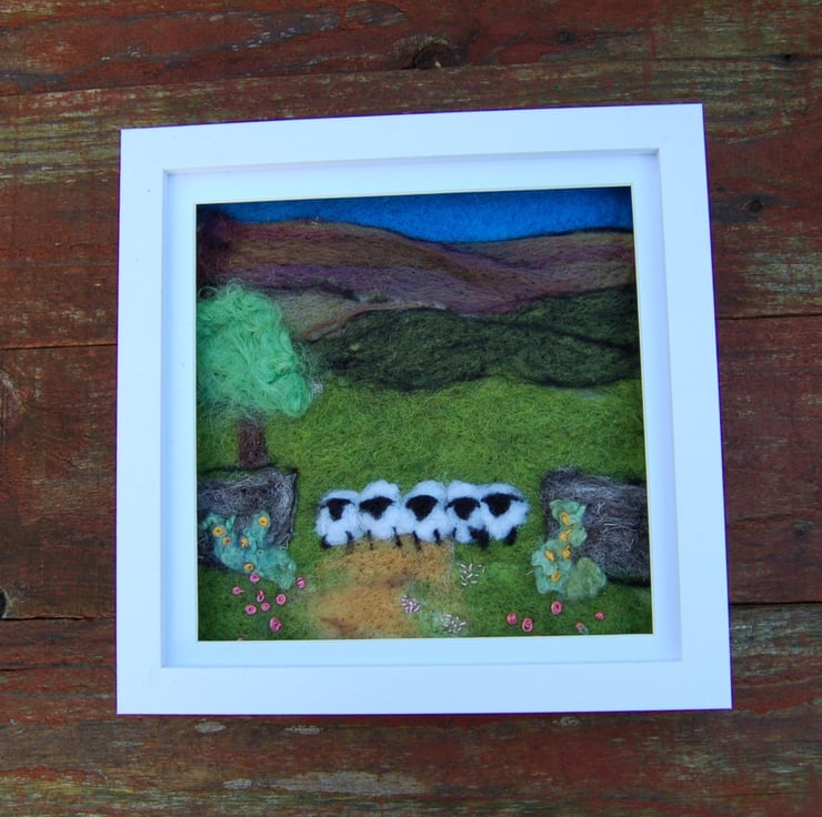 Five sheep stonewall wool painting.  Needlefelt picture with hand embroidery