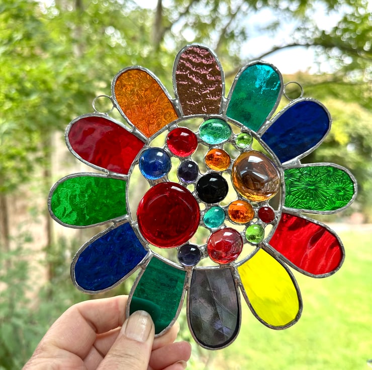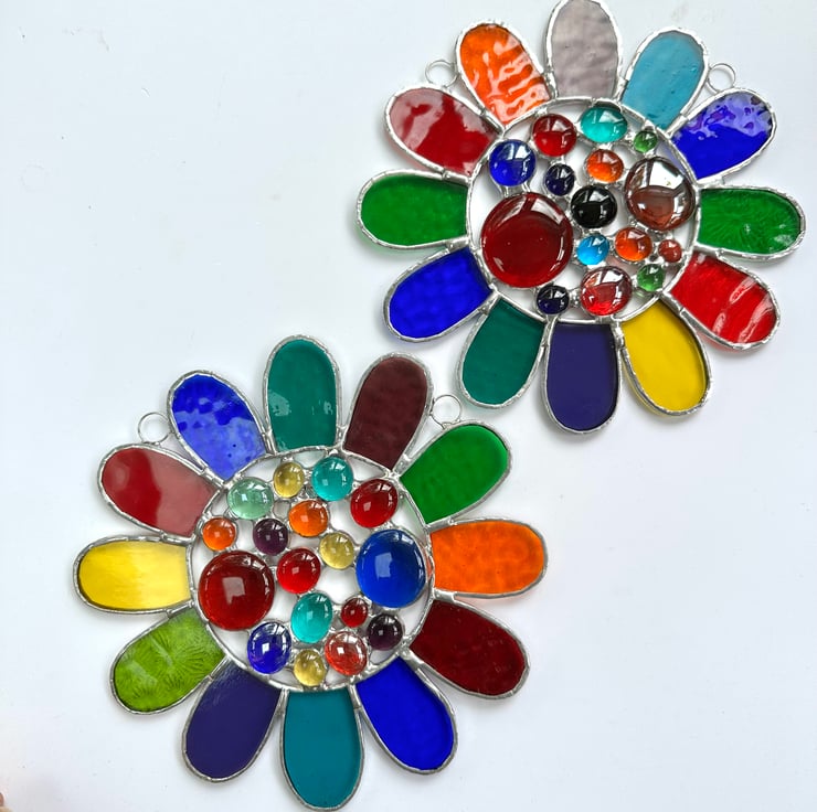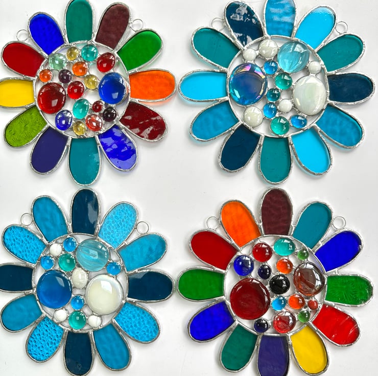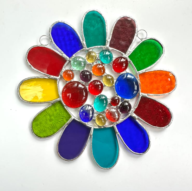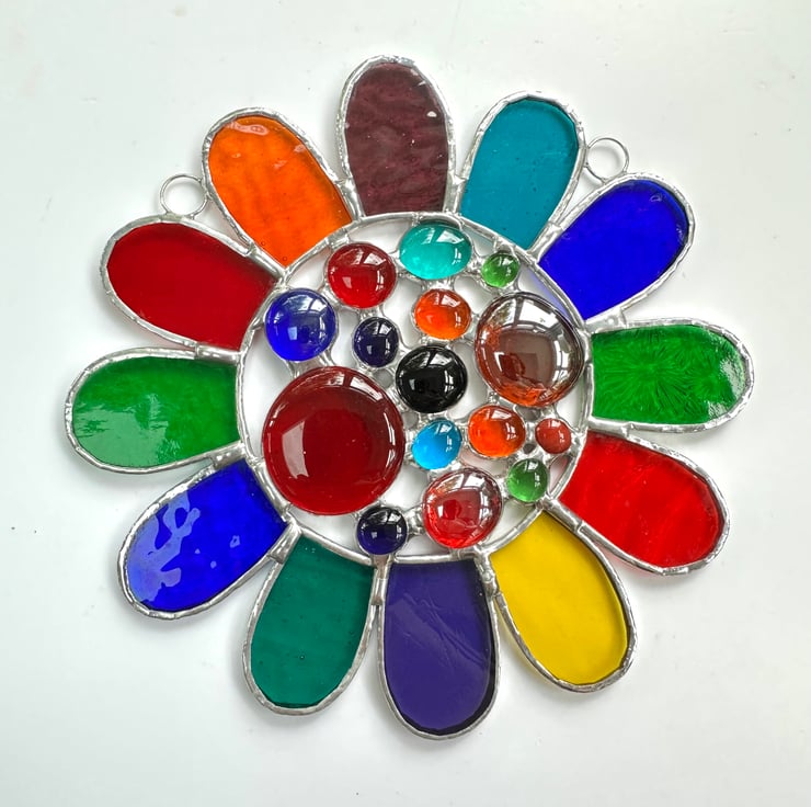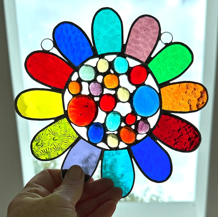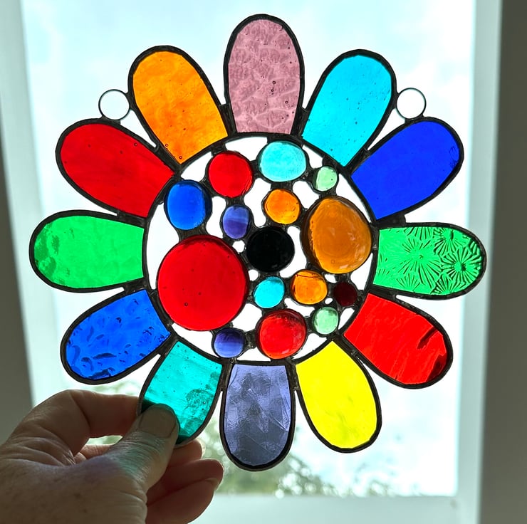This has been made using 12 different types of vibrantly coloured stained glass with a selection of coloured glass globs in the middle. It’s a great way to show all the different textures in the glass.