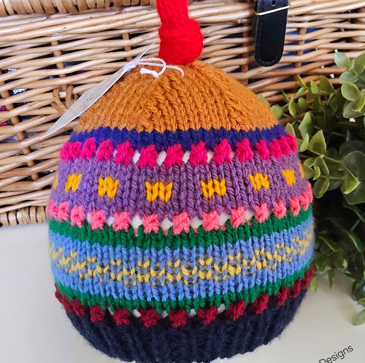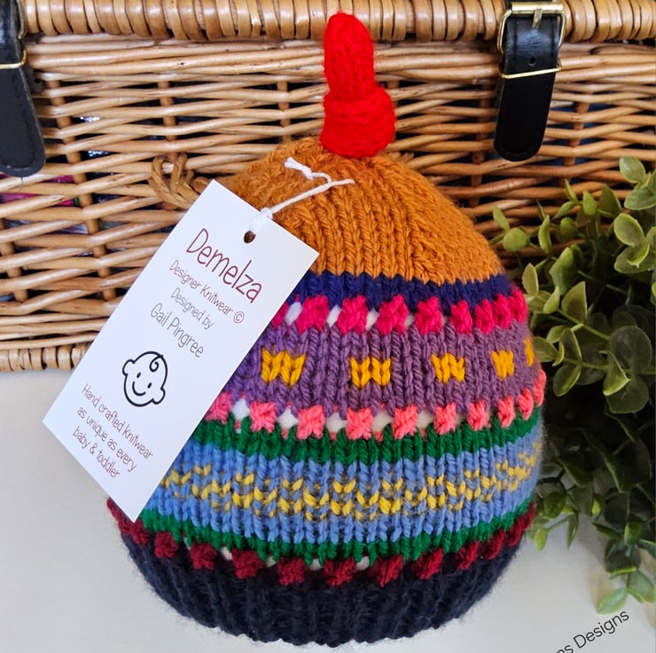 A unique eye catching baby knotted traditional fairisle pixie hat designed and lovingly hand crafted in Cornwall. The yarns used are premium machine washable acrylic. This adorable little hat will make a perfect token gift for any mother and baby to receive.