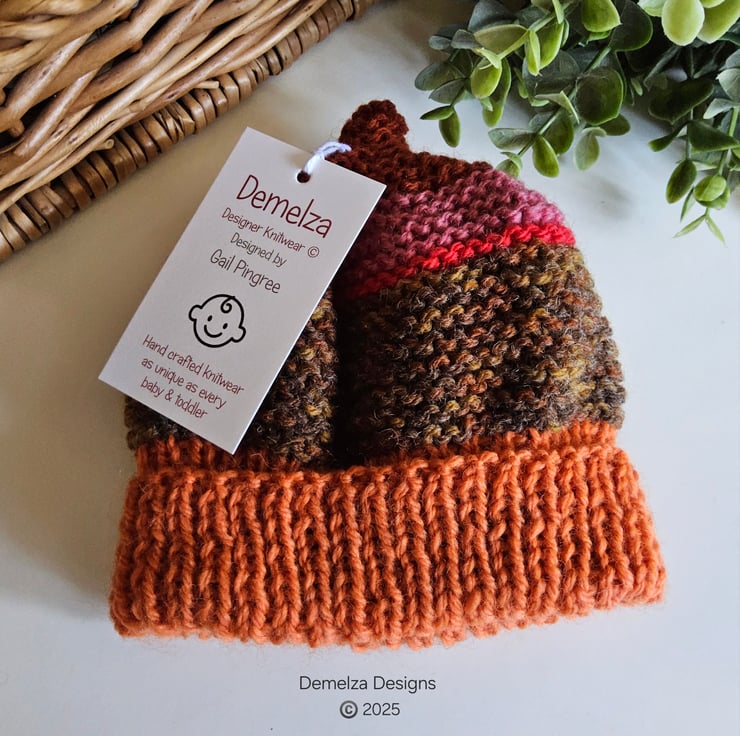A lovely practical baby boys hand knitted hat lovingly created in Cornwall from branded aran machine washable British yarns. The yarns have a mix of 20% marino wool with 80% premium acrylic.