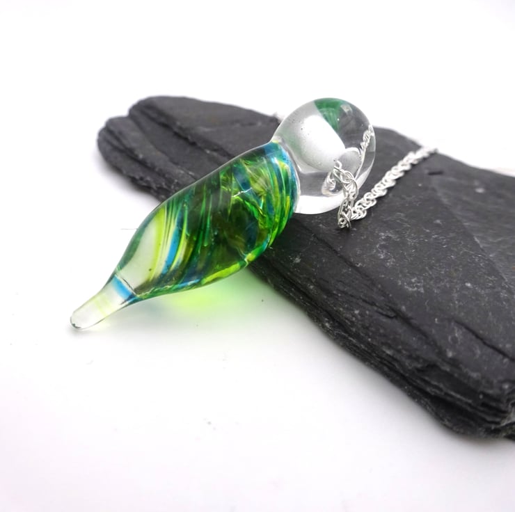 A sterling silver chain which features a handmade lampwork glass droplet pendant.