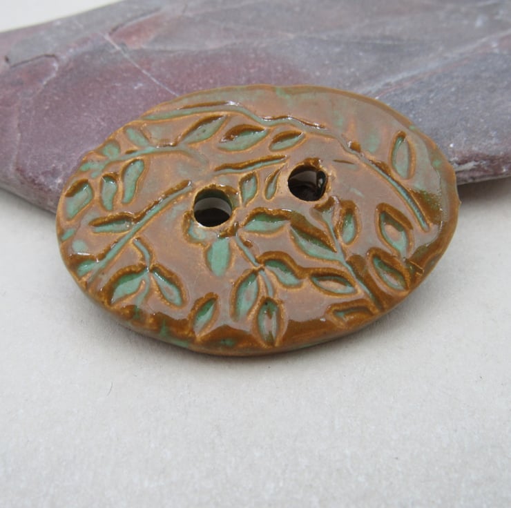 Medium oval shaped stoneware button, textured with a pretty motif of tiny leaves. Finished with a mid-brown glaze with green flecks
