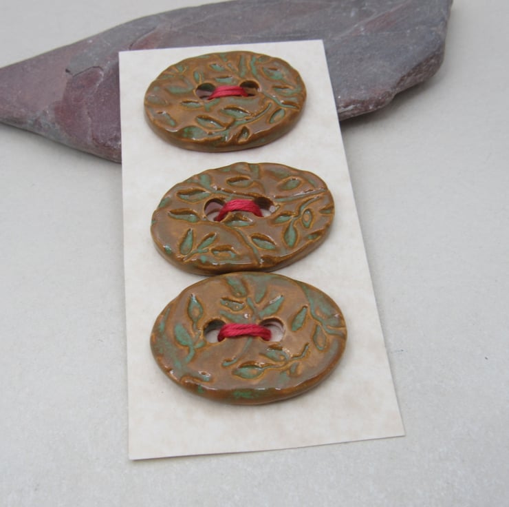 3 medium sized stoneware buttons, with a pretty leaf motif printed into the upper face. Finished with a mid-brown glaze with green flecks