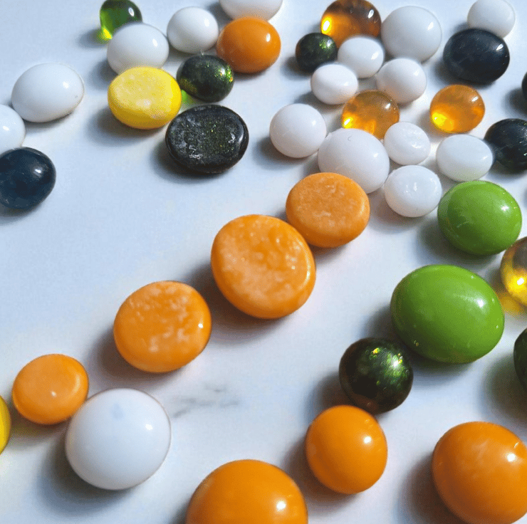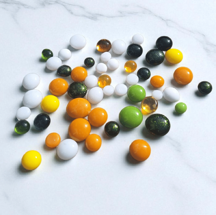 Add a fresh, spring feel to your next project with this handmade selection of fused glass cabochons. Crafted in my home studio from Bullseye glass COE 90, this 50g mix features soft green, bright yellow, and crisp white glass dots, perfect for a wide range of craft uses.
