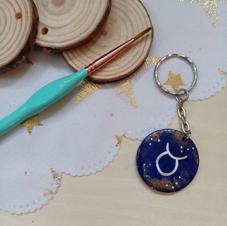 A 3cm round wooden keyring with a hand painted taurus starsign symbol design featuring a dark blue background and gold details