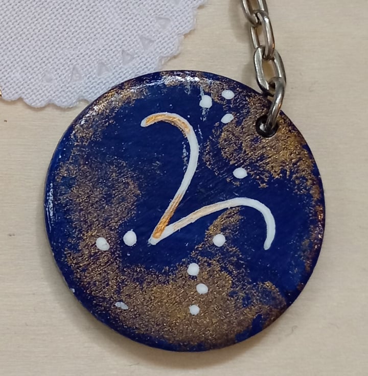A 3cm round wooden keyring with a hand painted aries starsign symbol design featuring a dark blue background and gold details