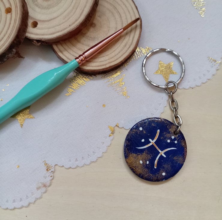 A 3cm round wooden keyring with a hand painted pisces starsign symbol design featuring a dark blue background and gold details
