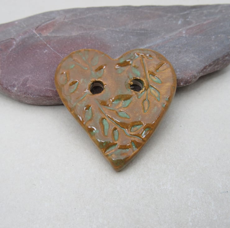 Medium heart shaped stoneware button, textured with a delicate leaf motif.
