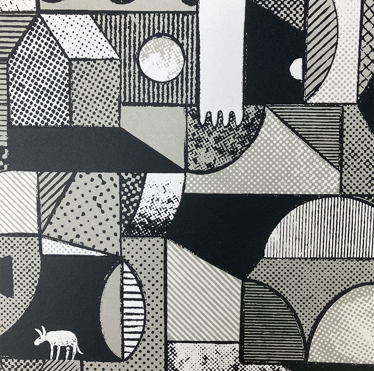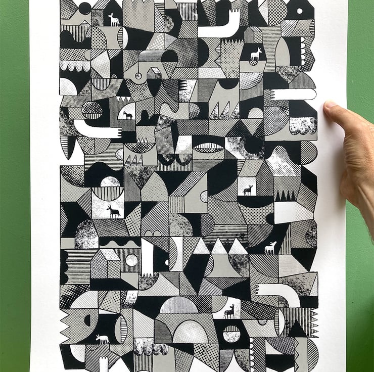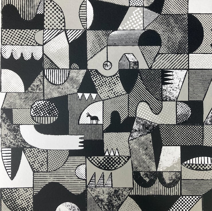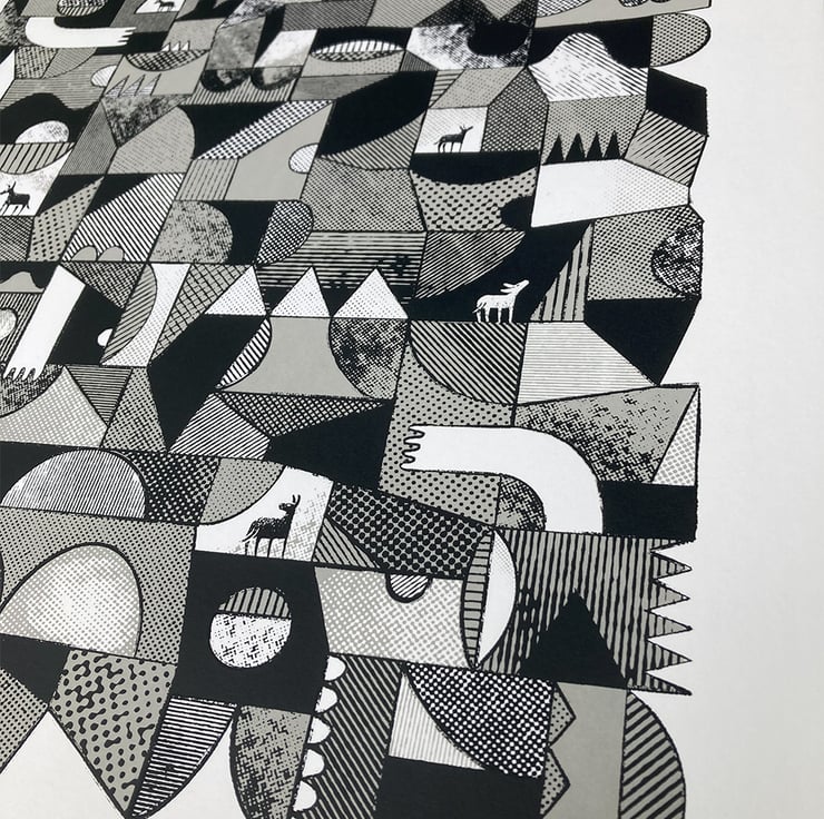 Black and light grey System 3 inks on white Seawhite 300gsm acid-free paper. From an edition of 22, signed, titled and numbered.