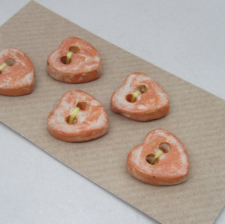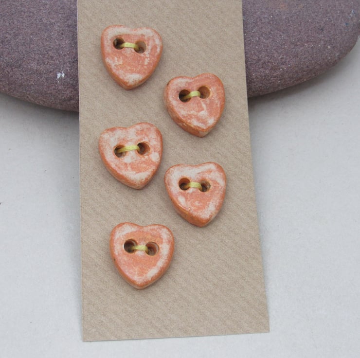 5 small stoneware heart buttons finished with a soft terracotta orange and white glaze