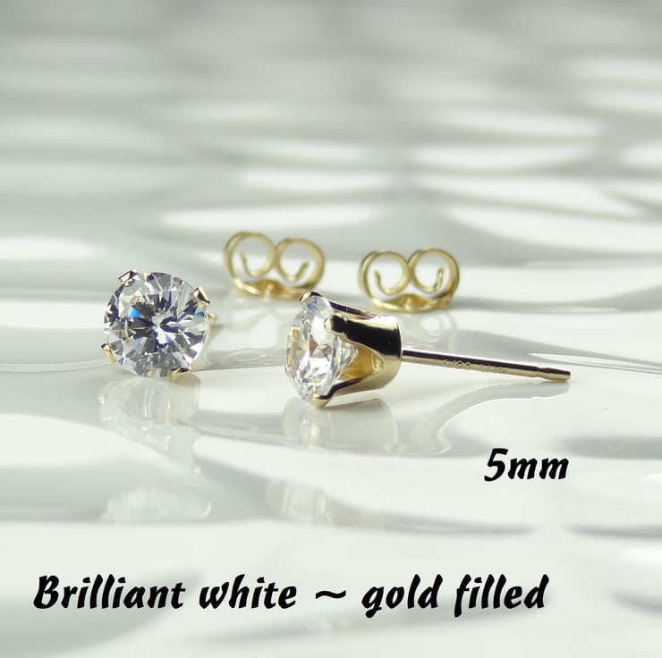 Cubic Zirconia stud earrings, sterling silver or 14k gold filled, colourless 5mm