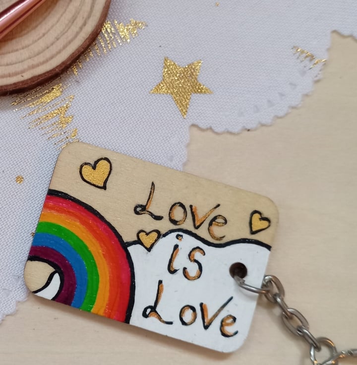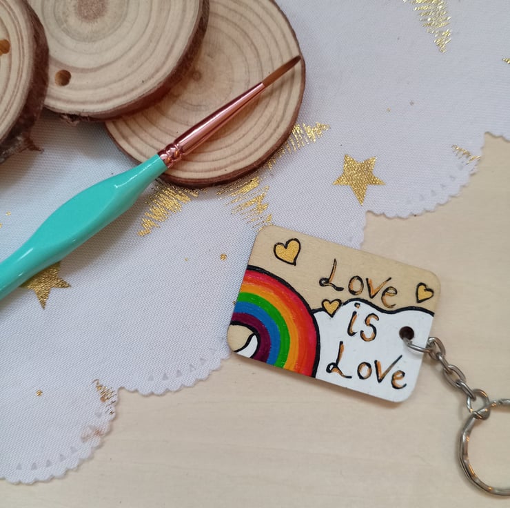 A 3cm x 4cm wooden rectangular keyring with a hand painted rainbow and cloud design with the words love is love