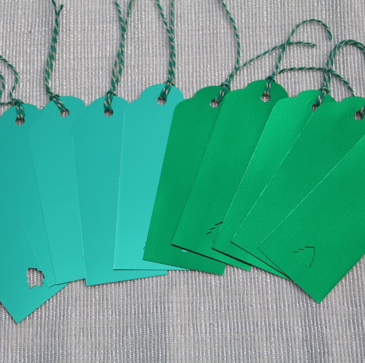 10 Christmas Gift tags, green foiled card, Christmas tree aperture, bakers twine
