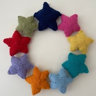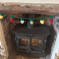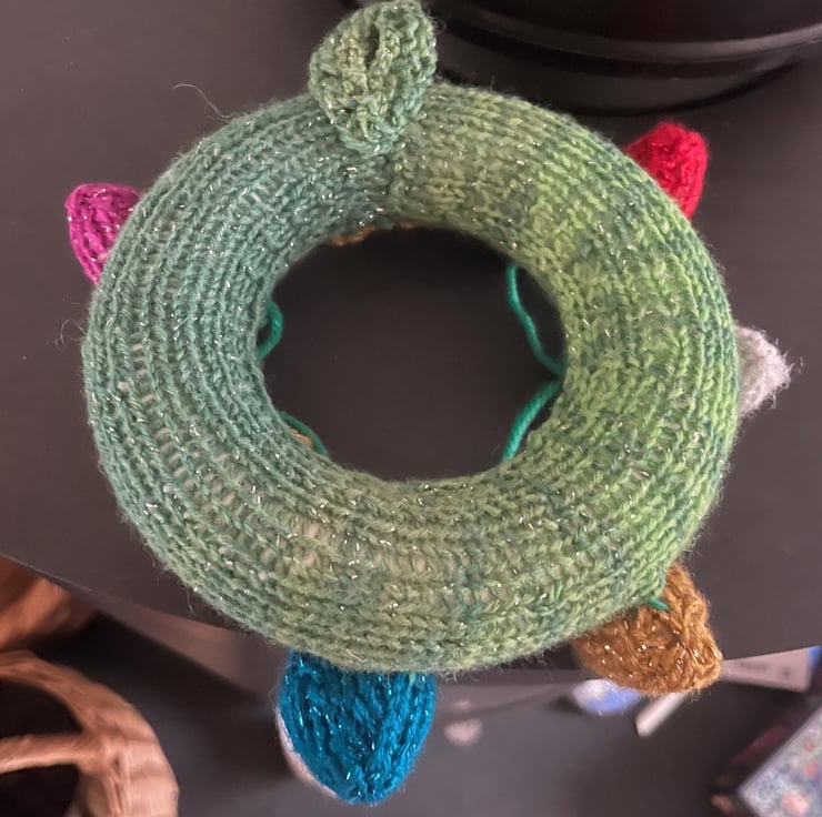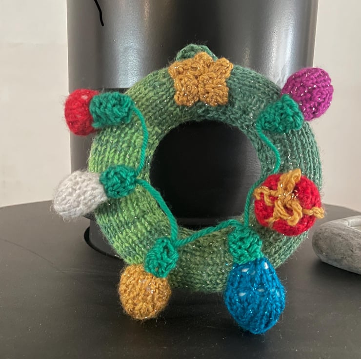 This sparkly green wreath is sewn around a 10cm polystyrene craft ring and then mini Christmas lights, a star and present were added.