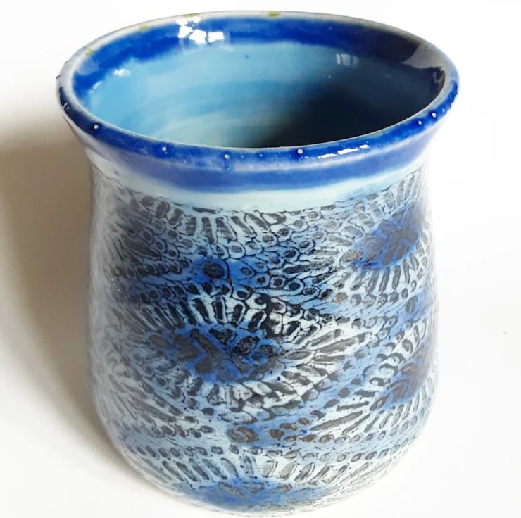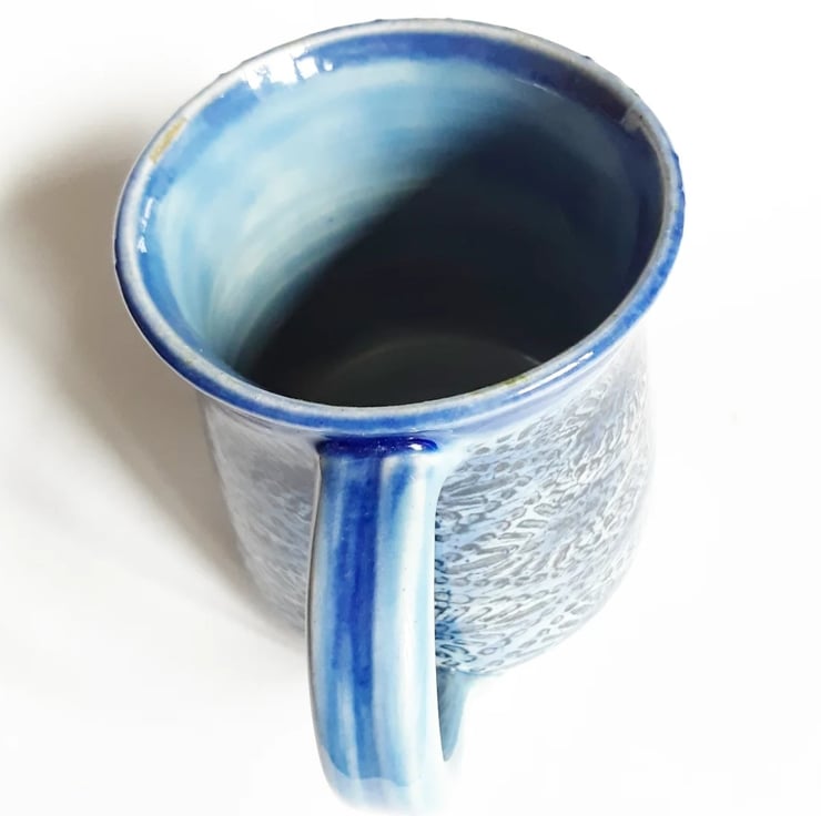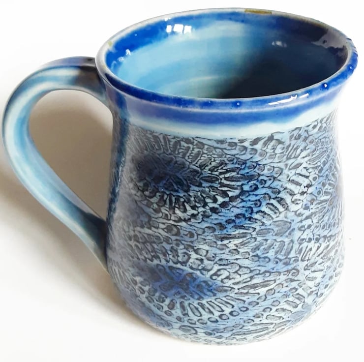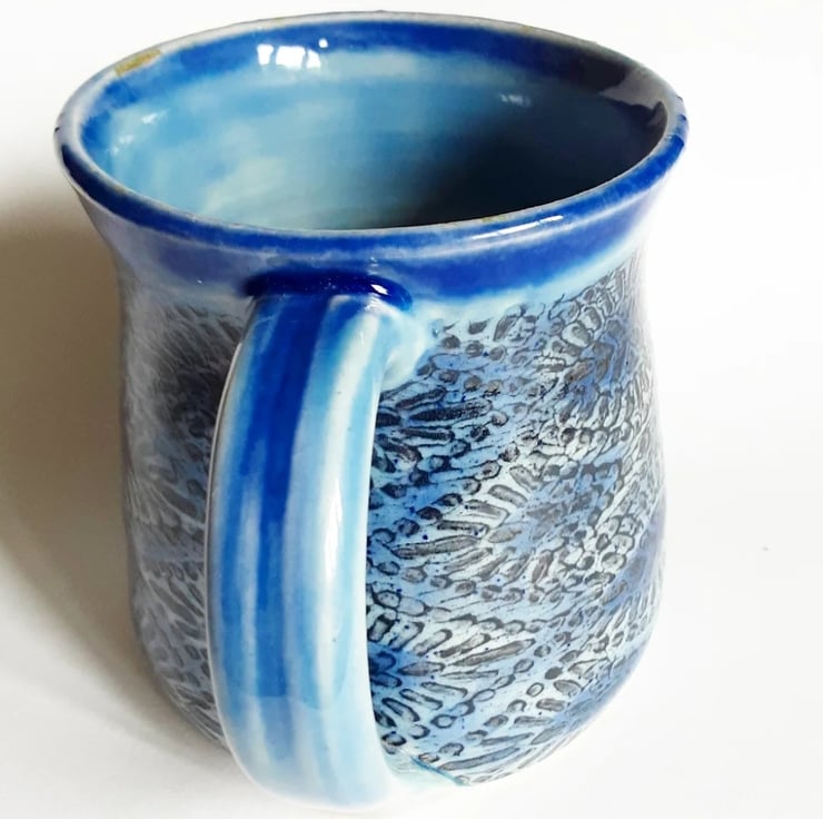 Glazed in blue glazes with a pattern on the mug.