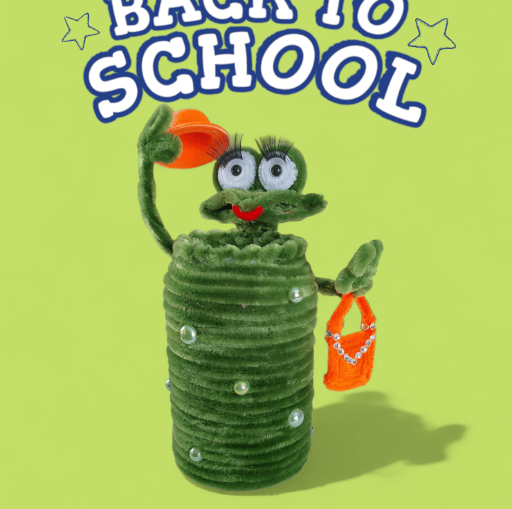 A fabulous frog pen holder with attitude and sparkle! Handmade from soft green pipe cleaners, this quirky character brings a splash of personality to any workspace. With big googly eyes, fluttery lashes, a cheeky red smile, and glamorous pearl-style embellishments, she's ready to brighten your day. Topped with a stylish orange hat and clutching a matching sparkly handbag, she’s not just functional – she’s fashion-forward!
