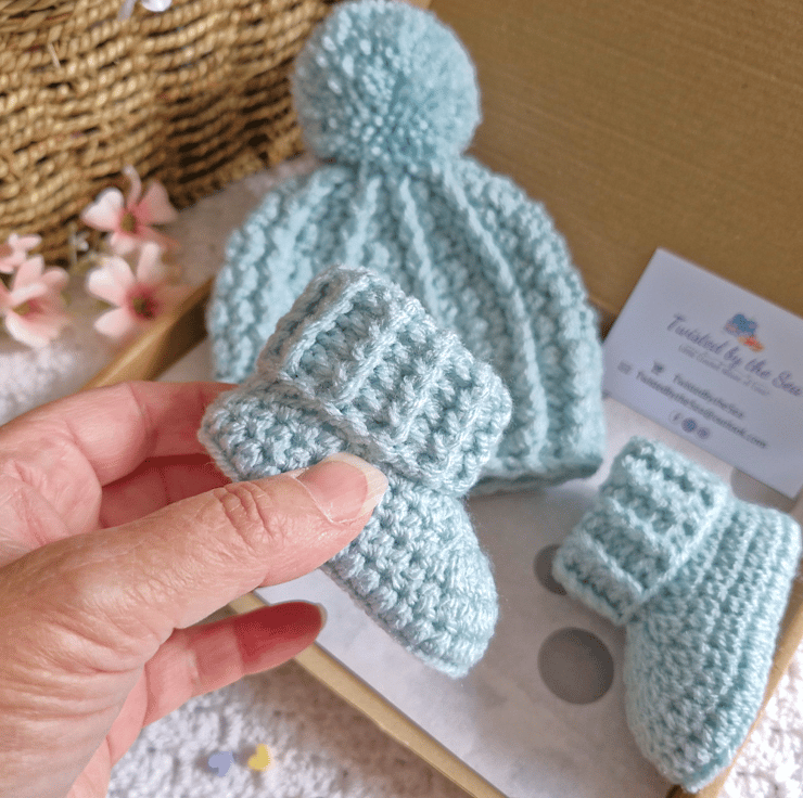 Welcome to Twisted by the Sea – home of beautifully handmade crochet baby gifts including baby booties, hats and cardigans. Each item is thoughtfully crafted using soft Stylecraft Special DK yarn, perfect for new arrivals, baby showers, and keepsake gifts. All made from my coastal home in Lincolnshire.
