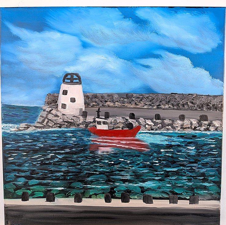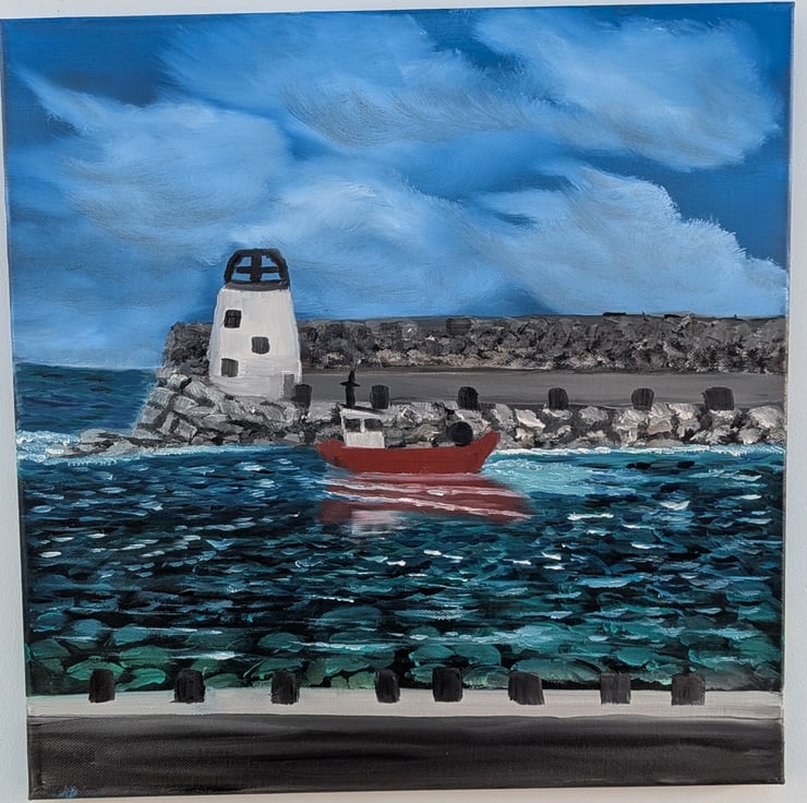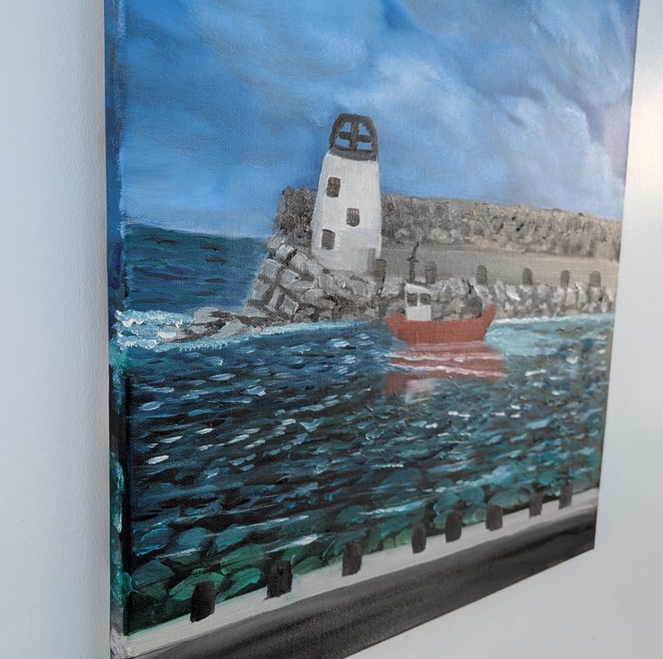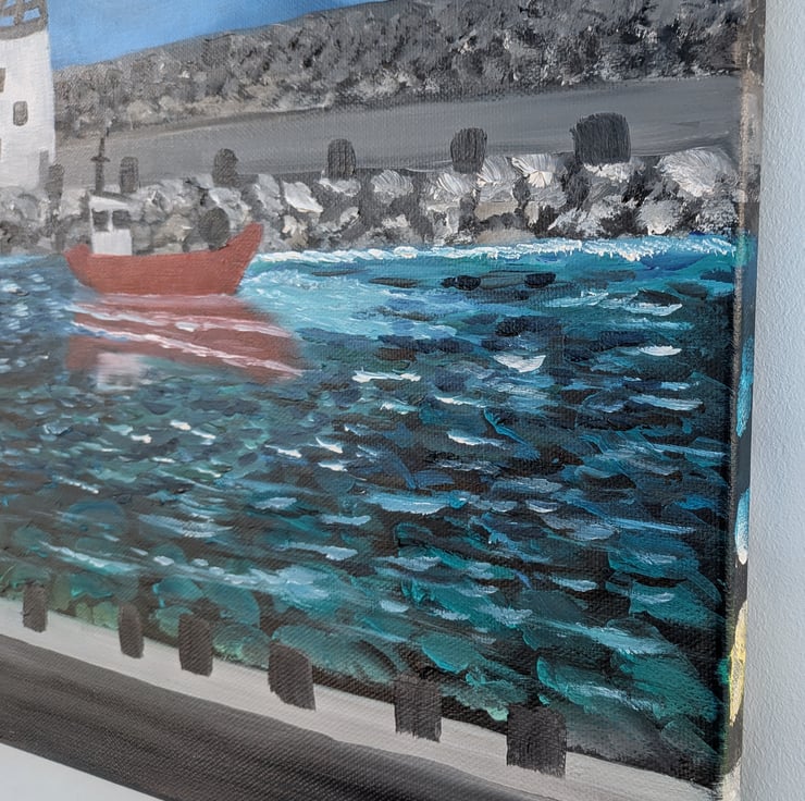 This original abstract Oil painting depicts a small Harbour entrance. Many of this style of Harbour can be found throughout Britain, especially in coastal areas of the Scottish Highlands. These ancient Harbours were once bustling with the activity of landing Herring, a fish that was in abundance in the cold northern waters. The historical significance of Herring fishing was so crucial to many local Highland economies that these fish were known as " Silver Darlings".