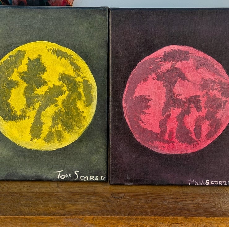Each of these paintings by Tom, depicting a full moon on a misty backdrop, offers a versatile display. Whether you choose to hang them as a complete set or on individual walls, they will add a touch of elegance and mystery to your space.