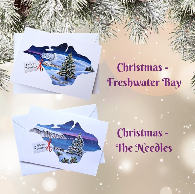 An Isle of Wight Christmas printed by me from my own original artwork. The snowy scene features the iconic Needles off the tip of West Wight as viewed from Headon Warren.