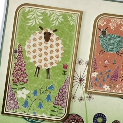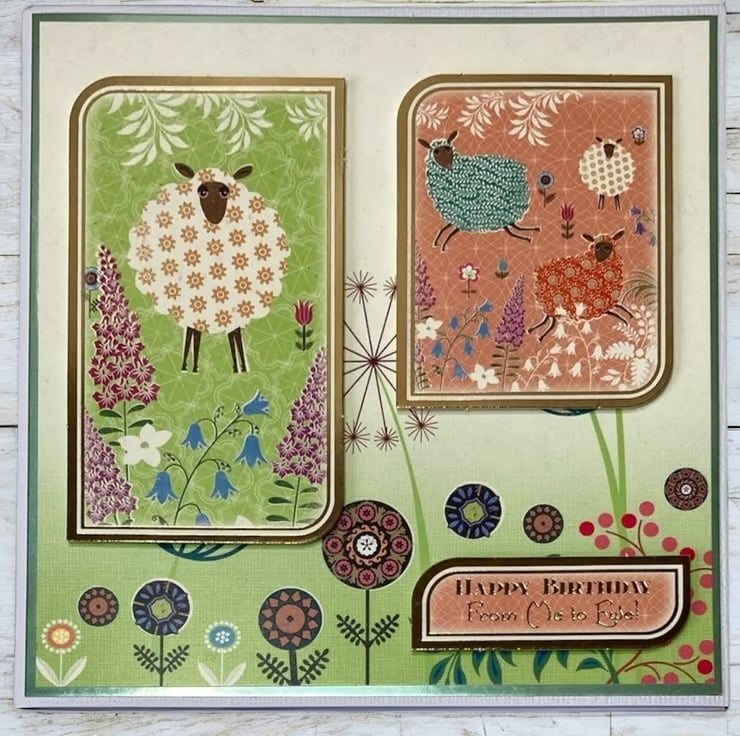 This charming card features a white linen base layered with green mirror card and abstract floral paper, two large gold-foiled toppers showcasing adorable sheep in a flower-filled meadow, mounted in 3D for extra dimension have been added.