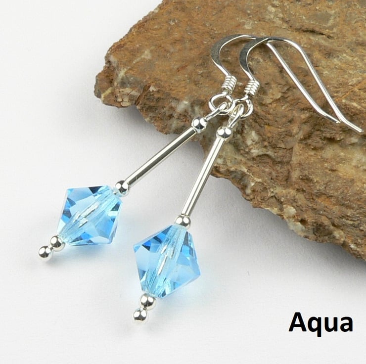Aquamarine blue Preciosa crystal drop earrings, sterling silver, 8mm, bicone