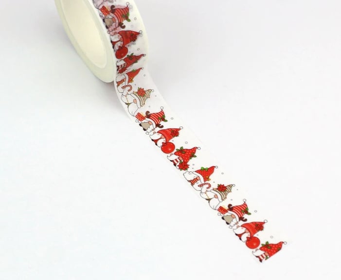 Christmas patterned tape, red and white festive gnomes with presents, candy canes and floral accents.