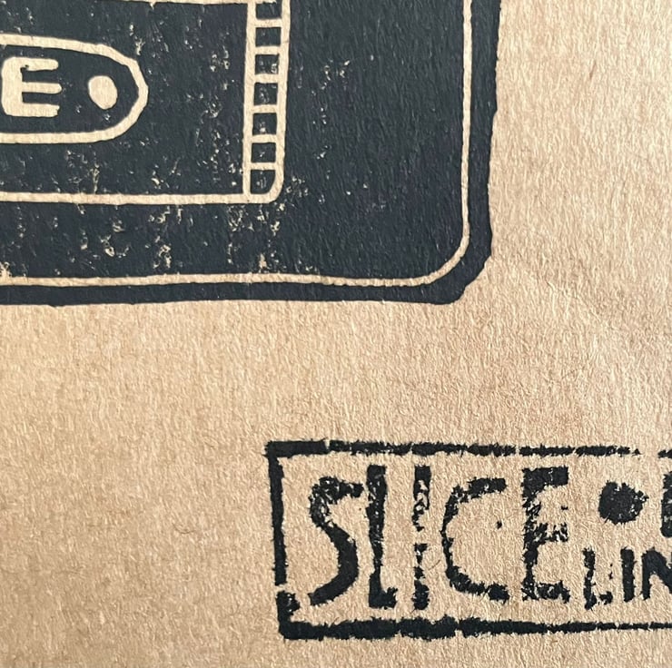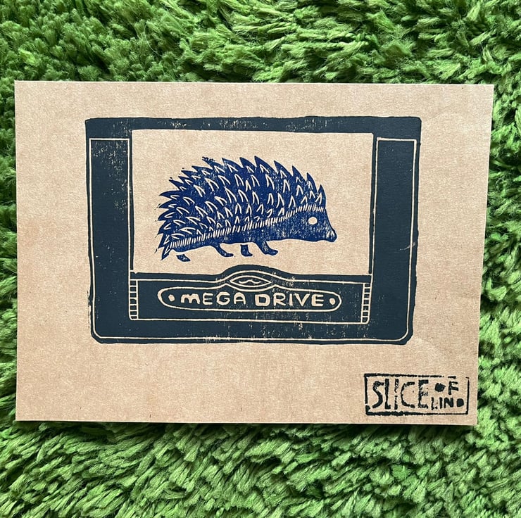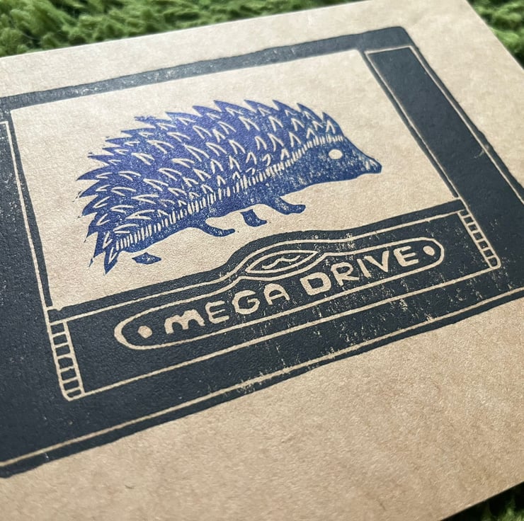 A lino print of the blue blur himself! Placed on a black Mega Drive cart. All made by myself from lino and printed in my York home studio.