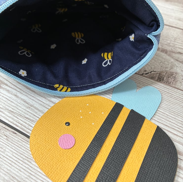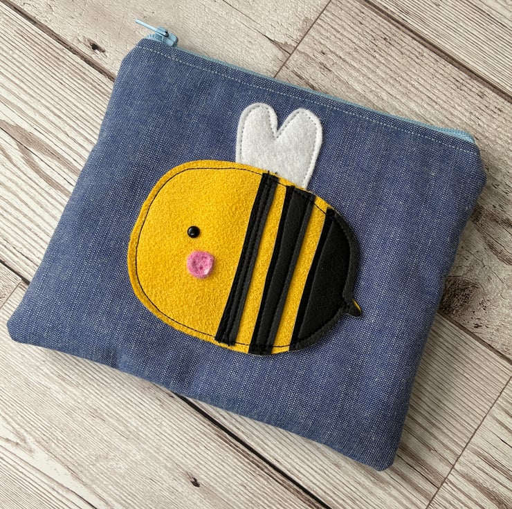 The purse itself is made of plain cotton fabric with a linen look on the outside, with a cute bee fabric for the lining. It has a contrasting light blue zip. The purse has been made with wadding to give it a nice padded look.