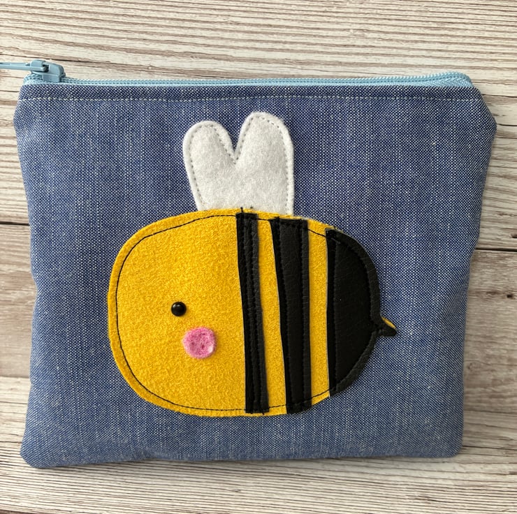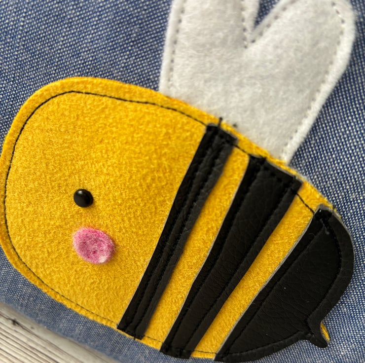 BUZZZ! This little bee purse is sure to make anyone smile! Mr Bee is made from faux suede and faux leather with little felt wings - so he is nice to the touch. He has been hand cut from these materials then sewn onto the purse. He is finished off with a little brad eye and rosey cheek.