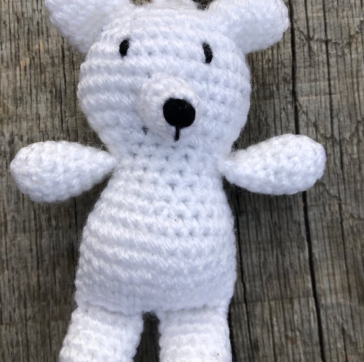 A white teddy bear handmade in crochet, simple, delicate, and incredibly cute. Perfect for baby showers, birthdays, or for anyone who loves handmade accessories that carry love and care in every stitch.